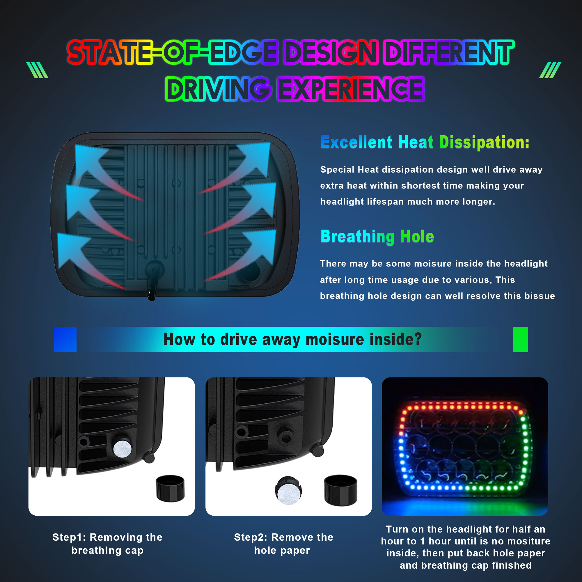 5.【More Complete Performance】H6054 Led headlights has IP67 waterproof rate,which is still work and very bright after in water for 2 hours and is effective dustproof.Stainless steel mounting bracket for rust and corrosion protection. Rapid cooling of aluminum alloy fins and high-quality thermal silica gel can effectively extend the life of the strip for more than 30,000 hours.