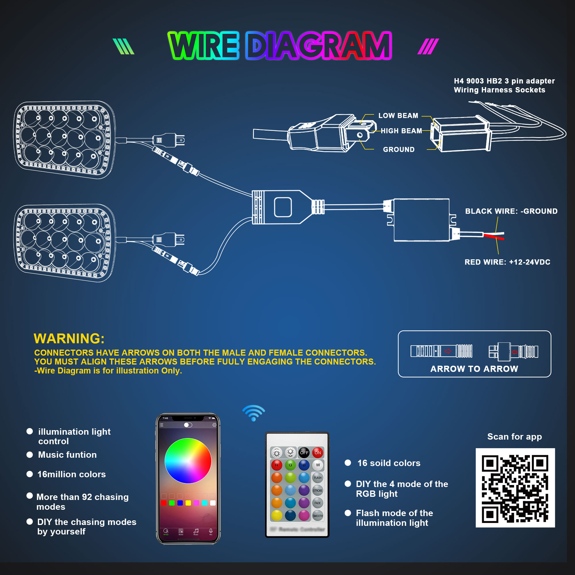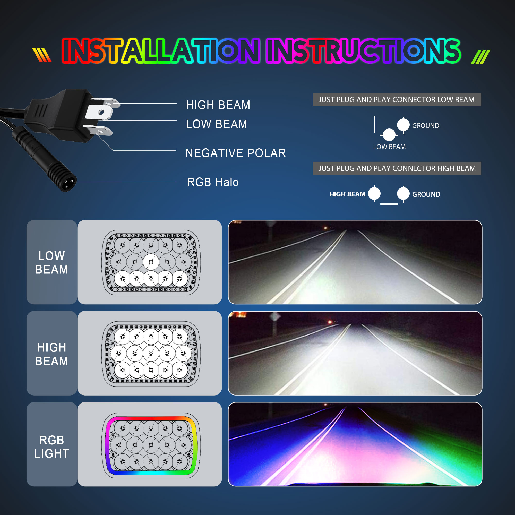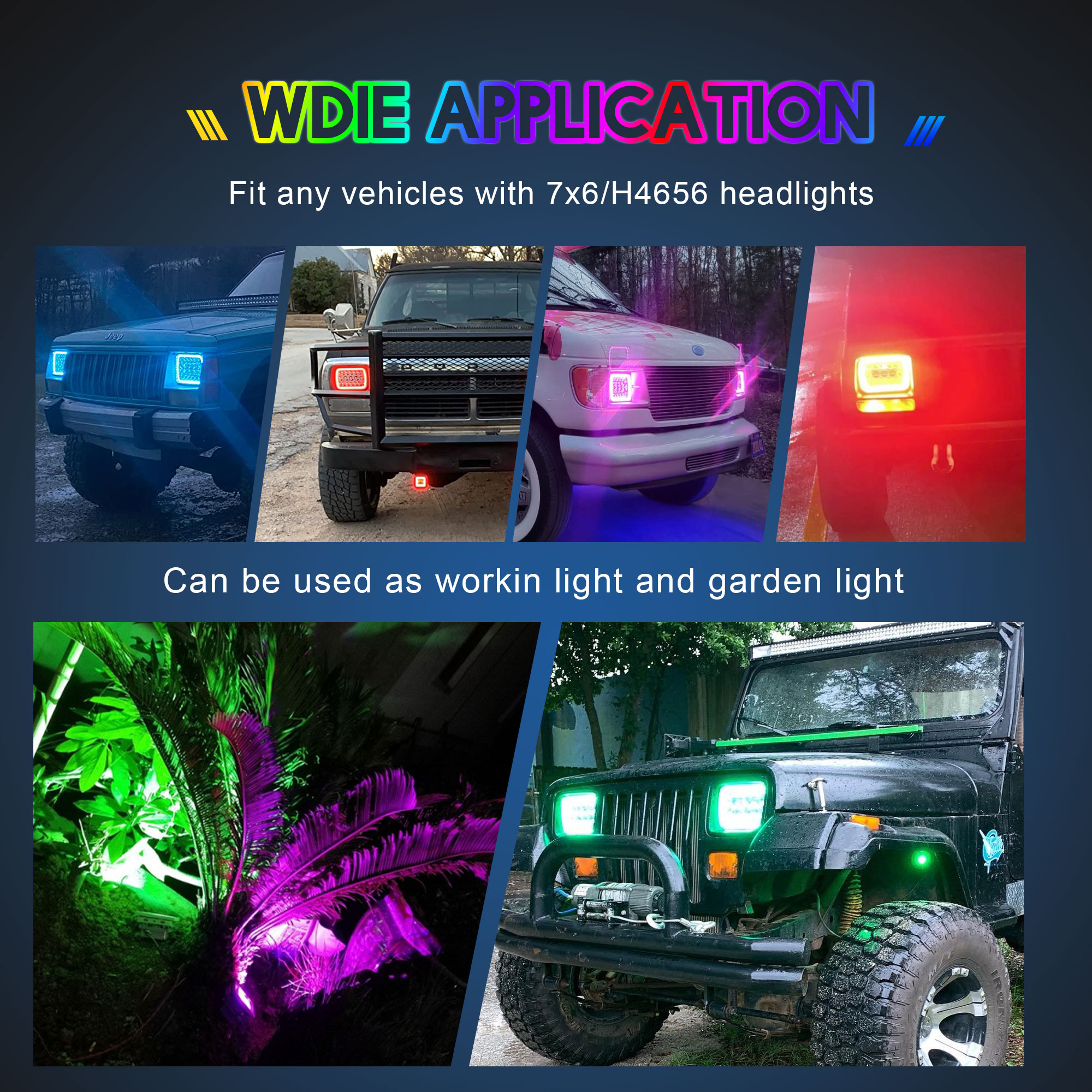 2.【7x6 LED Headliht with RGB Halo Ring Chasing Light】ROLINGER RGB Chase Halo with super bright 45w Headlamp for vehicles with 7x6 headlights sealed beam type also known as 5x7 led headlight offer reliable lighting and visibility. 16 solid colors and over 92 strobe flashing modes. Million of colors you can choose and the RGB 7x6 headlight will follow the rhythm of your music or your voice to glow, including rock, relaxing tunes and dance music. The APP or remote can be switched to control the whole 7x6 headlight smoothly.