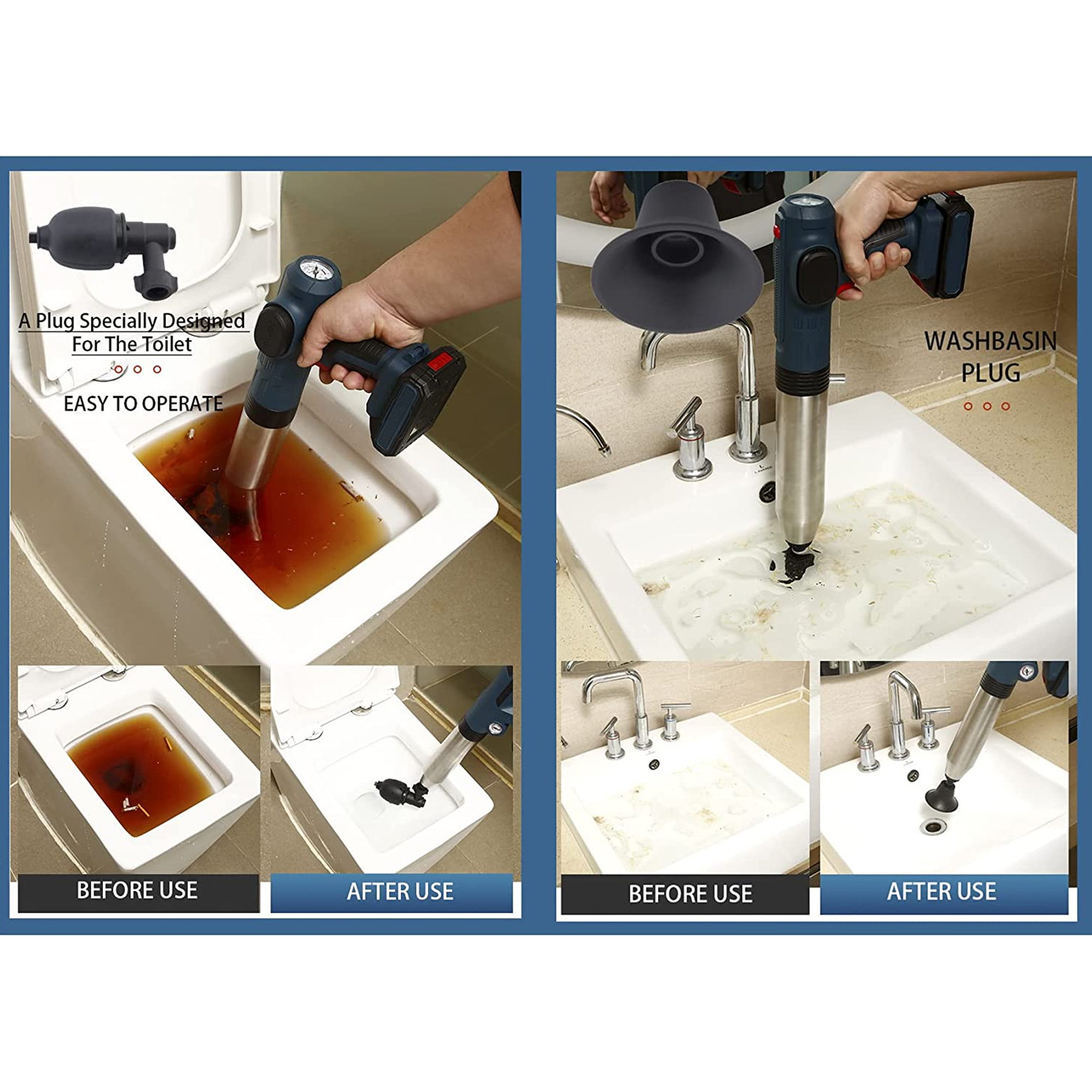 Versatile and efficient, this tool is perfect for unclogging anything from toilets, washstands, and washbasins to bathroom floor drains, kitchen sinks, and more. Equipped with a large capacity battery that stays charged through even the biggest jobs, this drain blaster requires no manual inflation or pumping. Including a removable rechargeable battery, adjustable plug, conversion connector, and user manual, you'll have everything you need to tackle your clog.