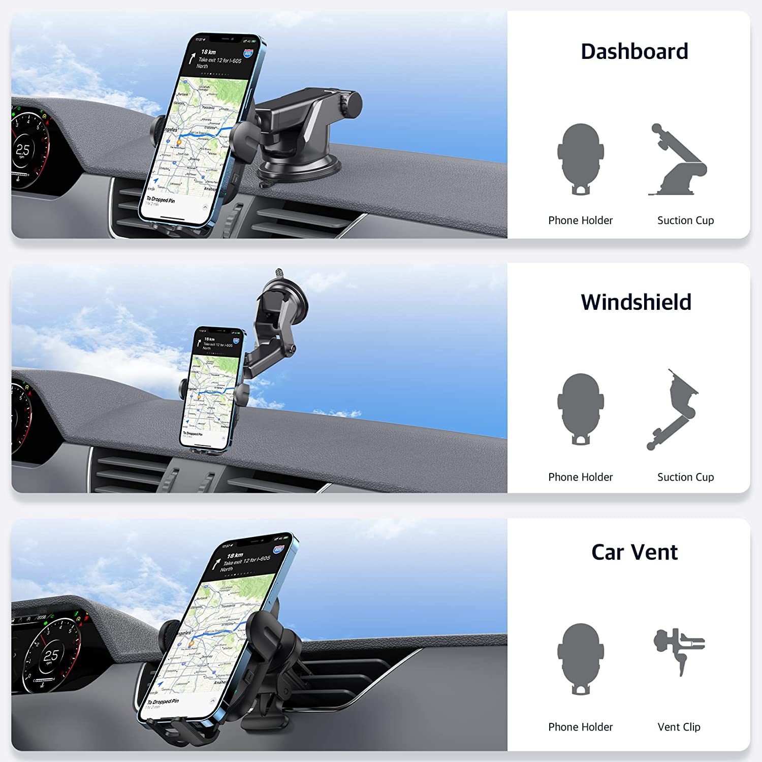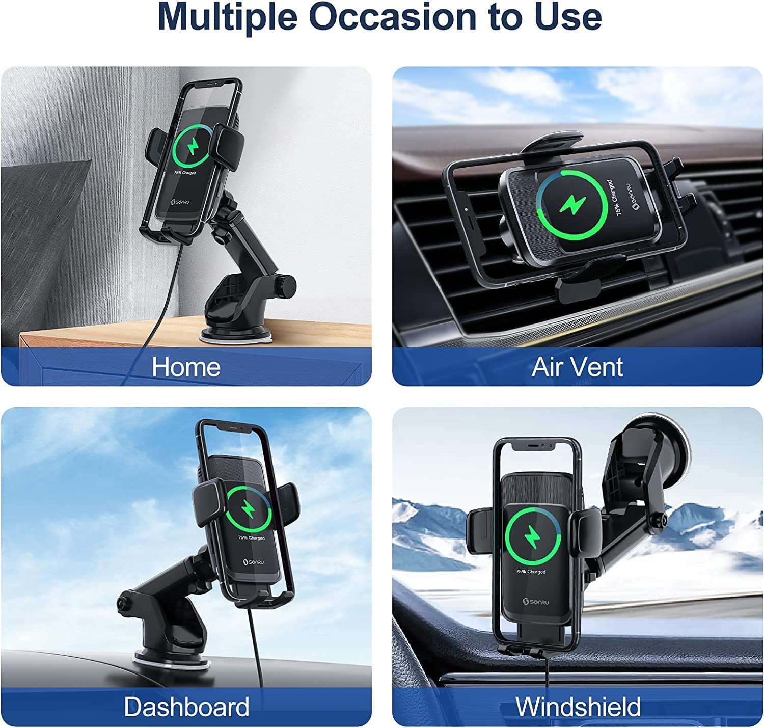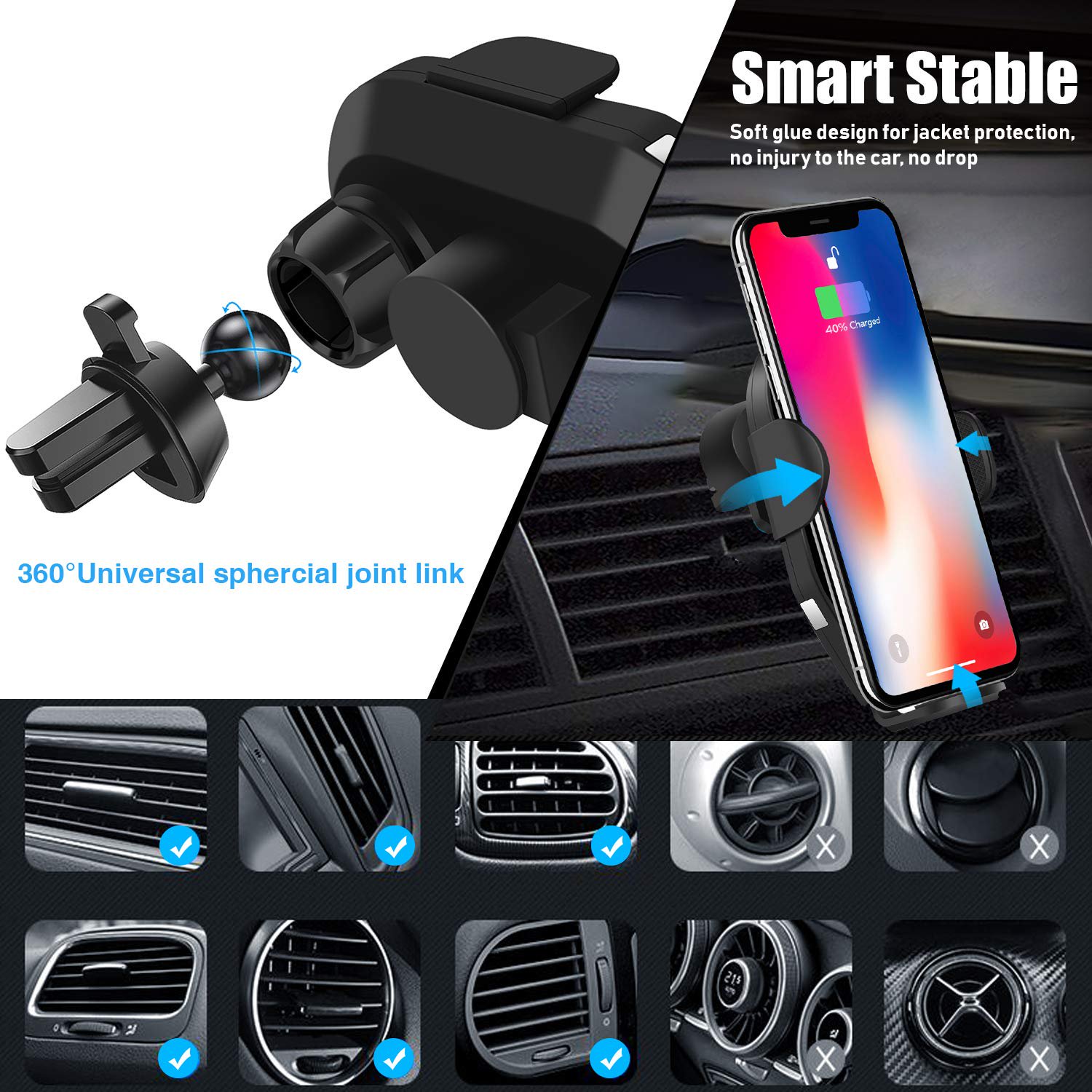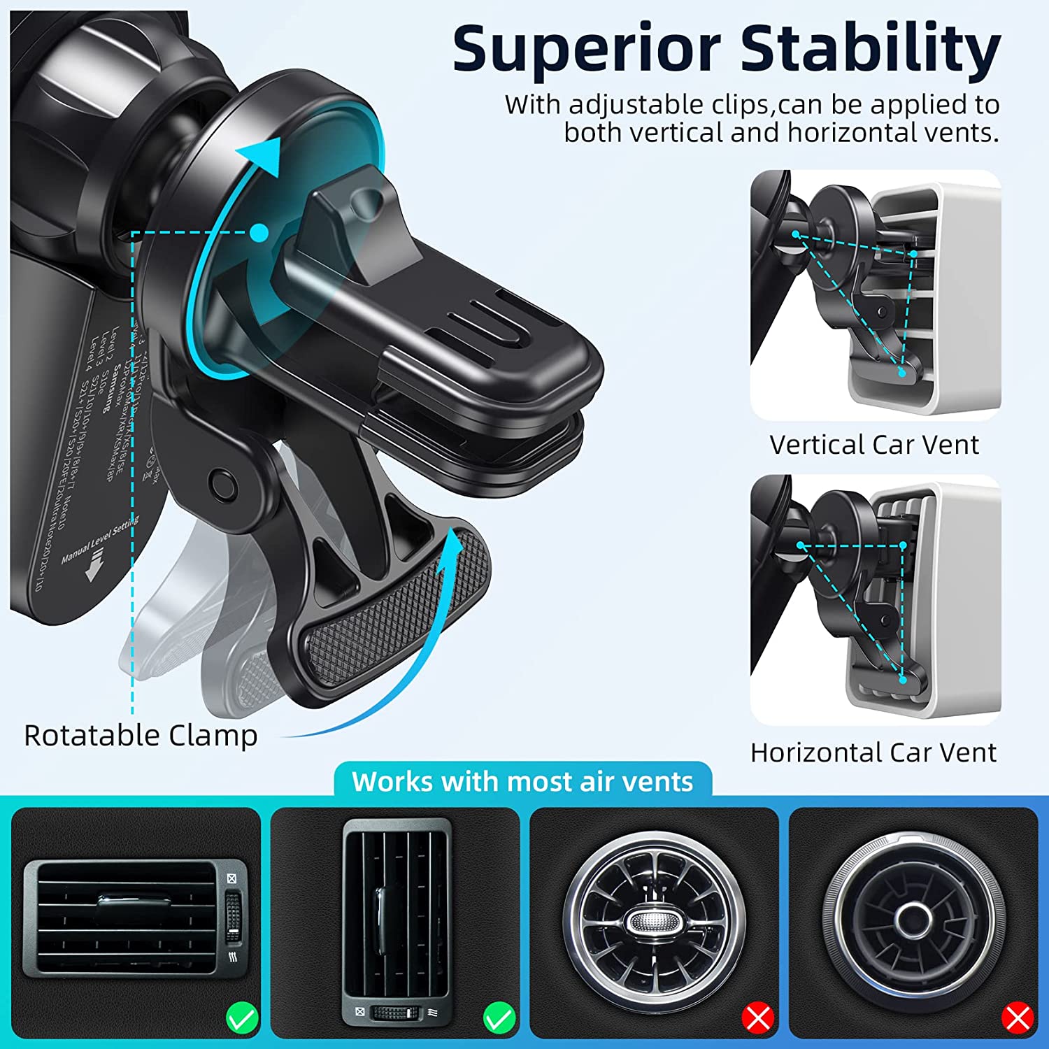 [Strong Suction Cup] The phone mount for car wireless charger's base is equipped with a powerful suction cup.Multiple installations of the wireless car charger holder, it can be not only installed on the windshield, dashboard, table securely with the strong suction cup, but also on air vent with air vent clip.