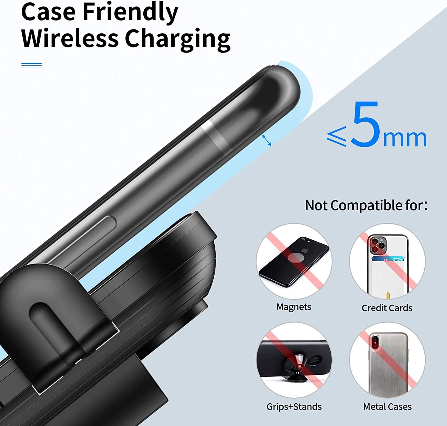 [2-IN-1 DESIGN] wireless car charger is made from premium aluminum frame and tempered glass.Wirelessly charge your phone in a car without messy cables to plug in while also ensuring the phone has enough battery life to use GPS and hold your phone firmly to keep safe driving. More convenient and safe.