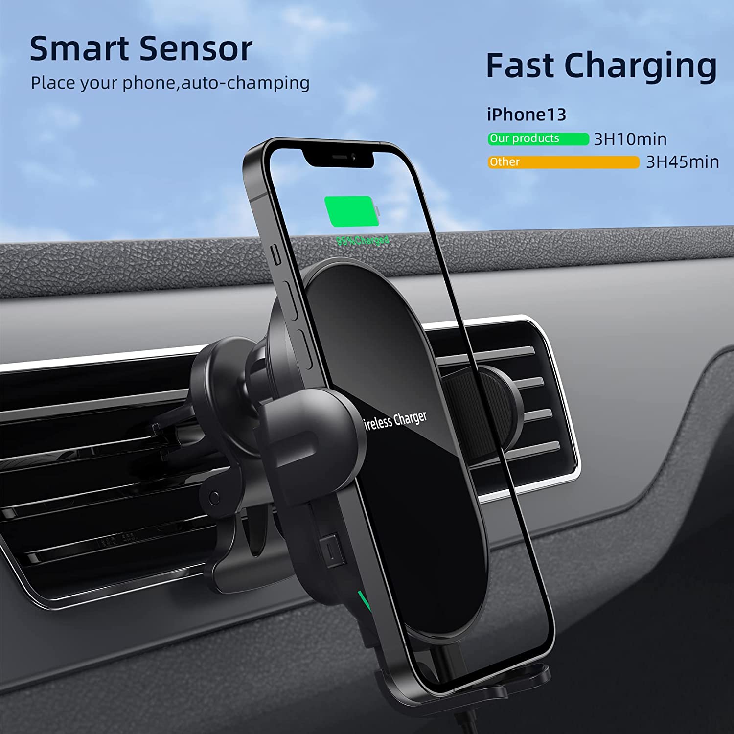 [AUTO-CLAMPING FEATURE] The side arms will automatically open once the power is connected. Insert your phone into the wireless car charger mount, the side arms will automatically close to grip your phone firmly and start charging.
