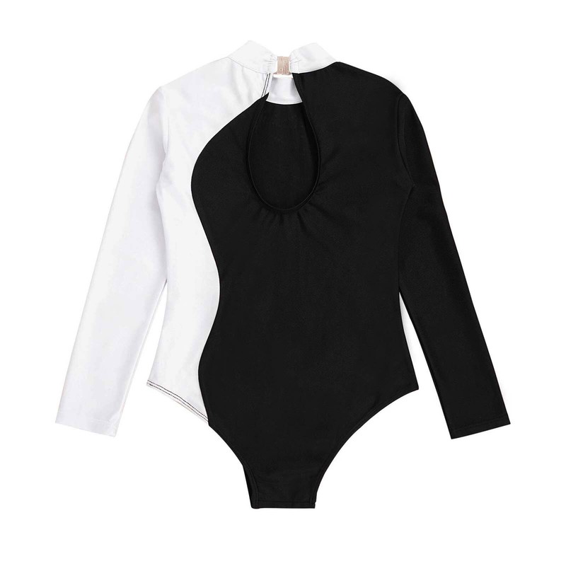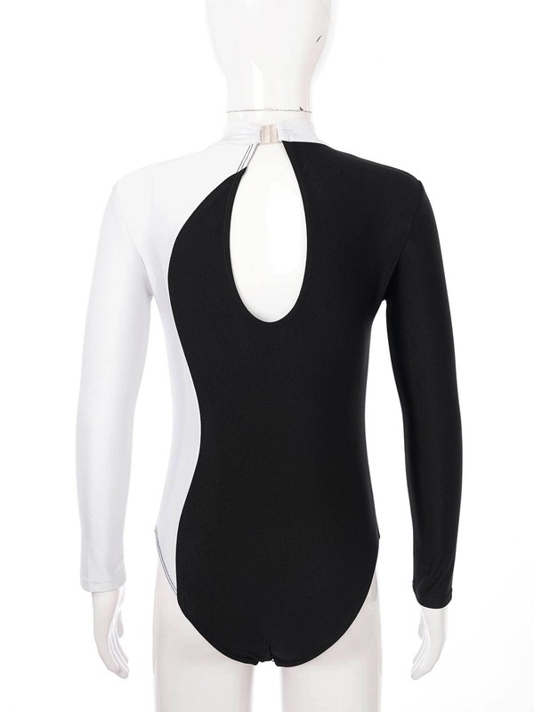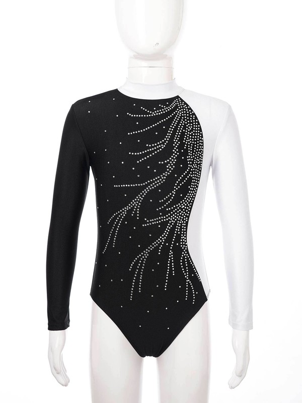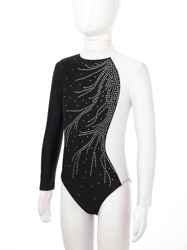 Kids Girls Mock Neck Long Sleeve Shiny Faux Diamonds Adorned Keyhole Back Dance Leotard.