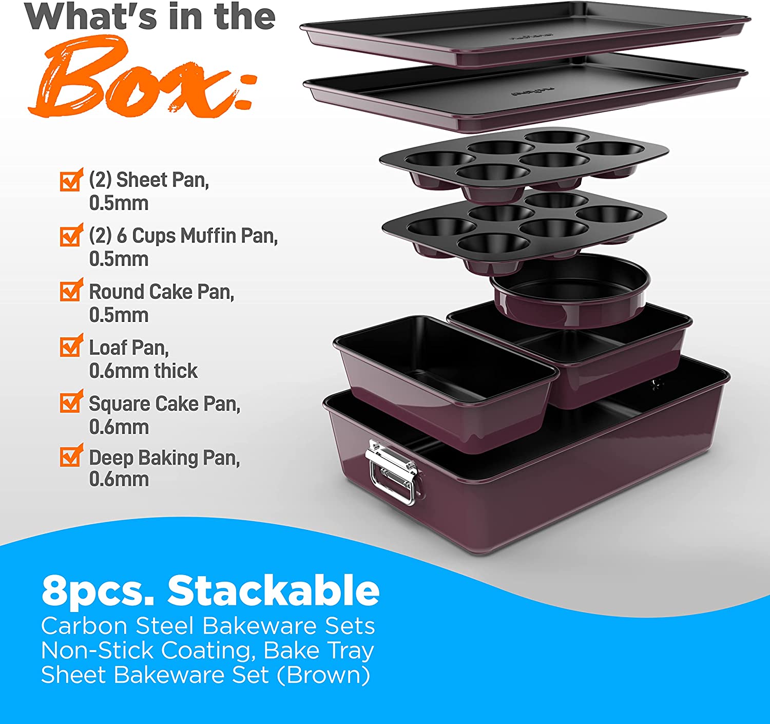 8-Piece Nonstick Stackable Bakeware Set - PFOA, PFOS, PTFE Free Baking Tray Set w/ Non-Stick Coating, 450°F Oven Safe, Round Cake, Loaf, Muffin, Wide/Square Pans, Cookie Sheet (Plum)