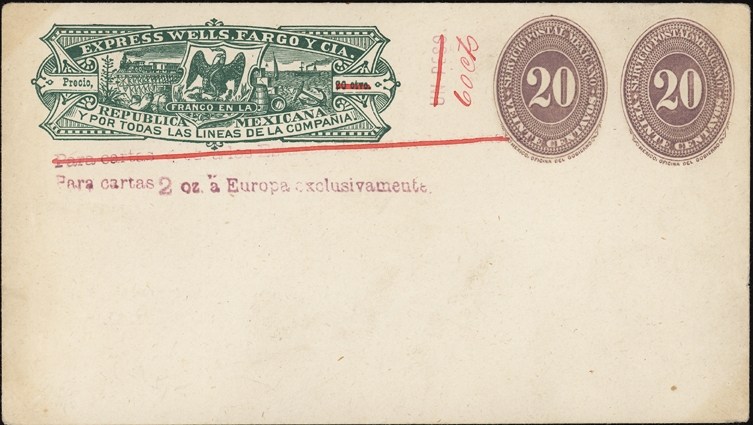 Mexico, 1886. Wells Fargo Envelope, 2 oz, Size a, 20c + 20c lilac numeral, 20 ctvo frank blanked out, 70 cvos. blanked out, 60 cts ms elsewhere, Europe line 3. UPSS WF 45a, H&G 30. Flap not adhered, few minor tone spots, hinge marks. Mint, F-VF.