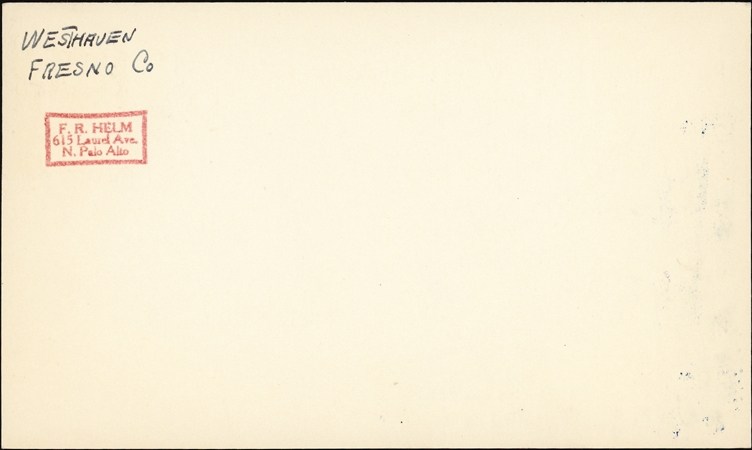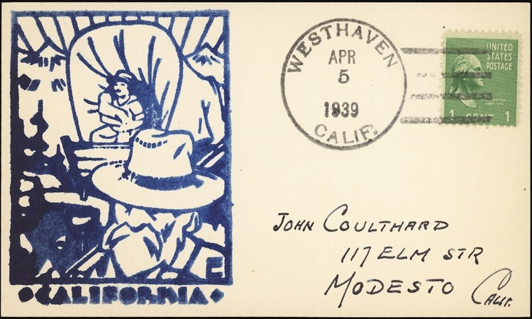 United States, 1939. Post Card sent from Westhaven, Fresno county, addressed to John Coulthard, Modesto. Tied by Westhaven cancel Apr 5 1939, Helbock scarcity 1. With Coulthard California cachet in blue. F-VF.