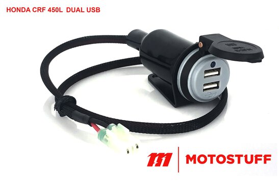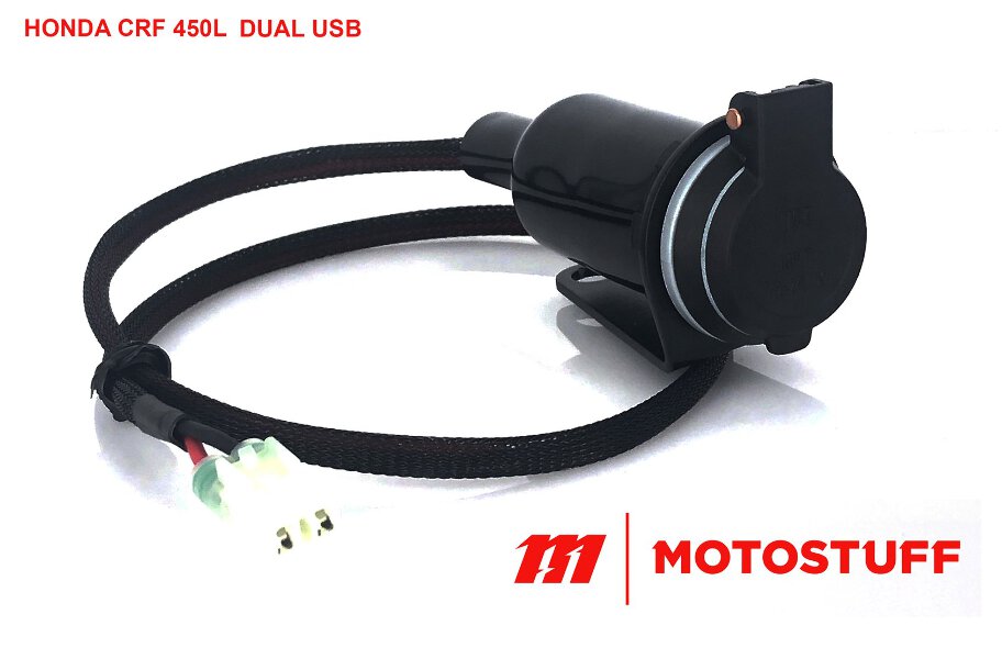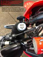 DUAL USB Version: This is a high-quality dual USB charger with an OE appearance featuring a water-resistant spring-loaded hinged cover. The dual USB charger outputs 2.1 amps per port for fast phone charging and features a blue led indicator to let you know it's on. Easily installed in just a couple of minutes, all you need is a 10mm wrench or socket to install the bracket to the upper triple clamp. And plug the other end into the auxiliary power connector behind the lower left radiator area following the factory harness routing.