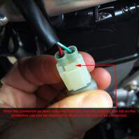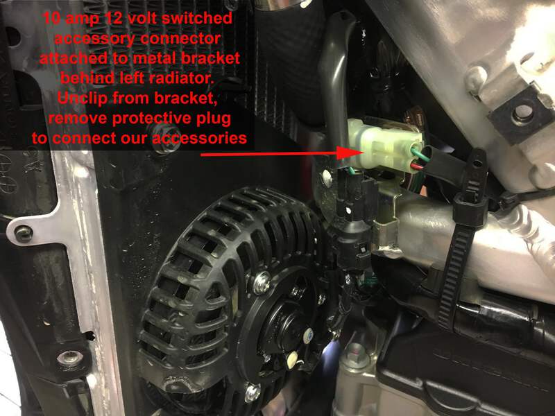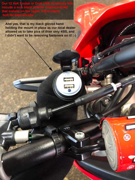 12 Volt Socket Version: (cigarette lighter style) This is a high-quality 12-volt socket we developed to offer an OEM appearance, with a water-resistant hinged spring-loaded cover. Easily installed in just a couple of minutes, all you need is a 10mm wrench or socket to install the bracket to the upper triple clamp. And plug the other end into the auxiliary power connector behind the lower left radiator area following the factory harness routing.