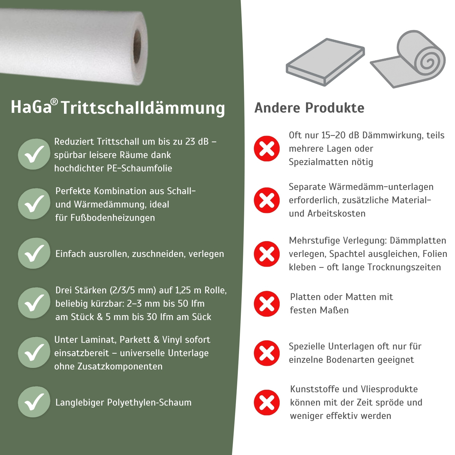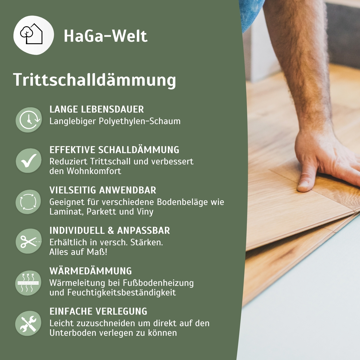 - VERBESSERTE RAUMAKUSTIK: die HaGa® Trittschalldämmung schützt nicht nur Vinyl-, Laminat- und Holzböden, sondern verbessert auch die Raumakustik.