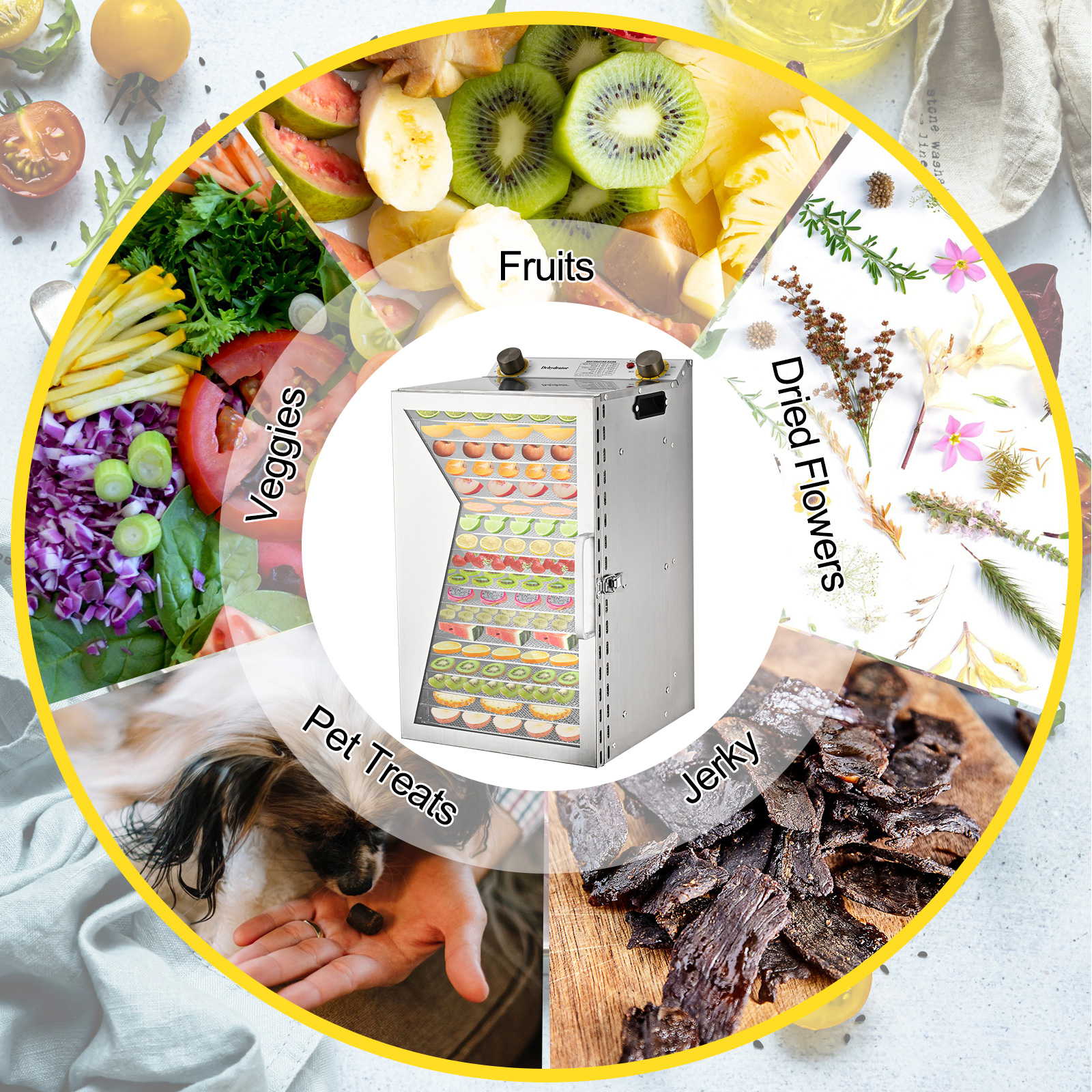 18 trays provides bigger capacity fitting for both home & commercial use. Scientific design of 0.98in distance between trays allows recirculating air getting through thus the fruit slice could heat evenly while it saves space for more food.