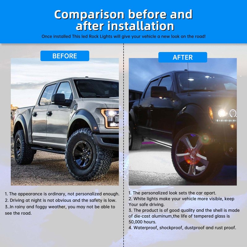 Product Description We are professional on led car lights, and serious to offer the best service to customers. You can install it anywhere you want: Easy installation, DIY style, could be mounted anywhere you want. Perfect for car's underbody interior exterior etc. You can use it in any harsh environments: Totally waterproof, shockproof, anti-corrosion, no worries work in rain or even work under water and harsh environments. Durable design & longer life span: