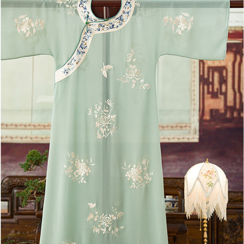 Lady Chinese Chiffon Sheer Cheongsam Embroidery Floral Long Dress Without Lining