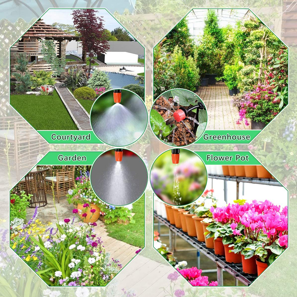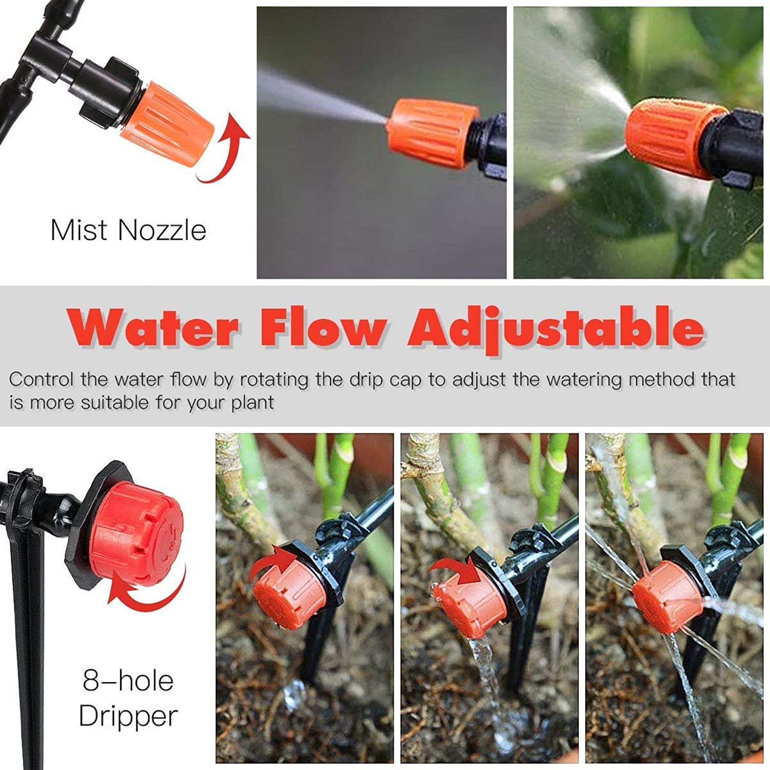 【Adjustable Micro DIY Irrigation Kit】 Drippers and Nozzles are also adjustable, controlling the water flow by rotate,the nozzles also provides a cool environment from the heat for outdoor areas.