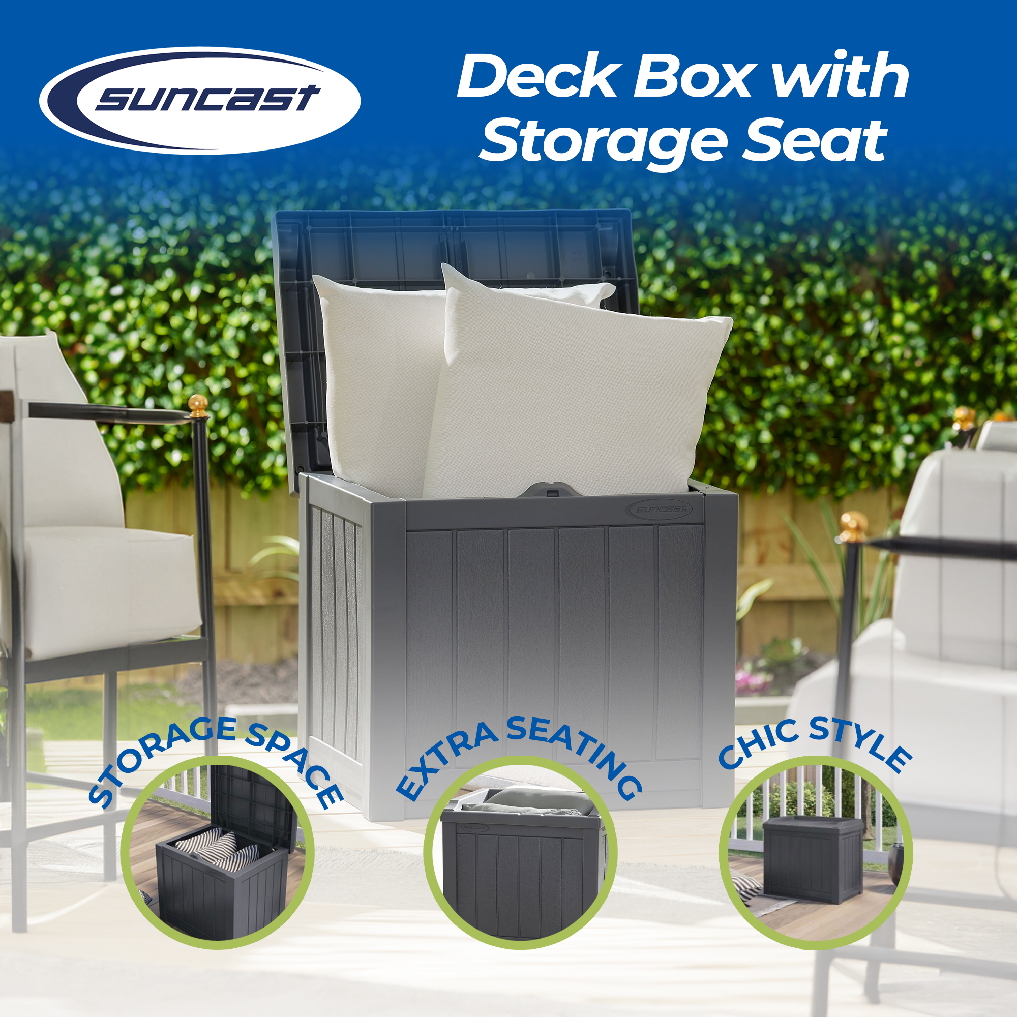 It's a storage container, it's a seat, and it looks great with the rest of your patio decor. It's the Suncast 22-Gallon Small Outdoor Deck Box with a Bench Seat, and it's here to make your patio equal parts classy and functional. Plus, its sleek design seamlessly blends with your patio decor, adding a touch of elegance to your outdoor space.