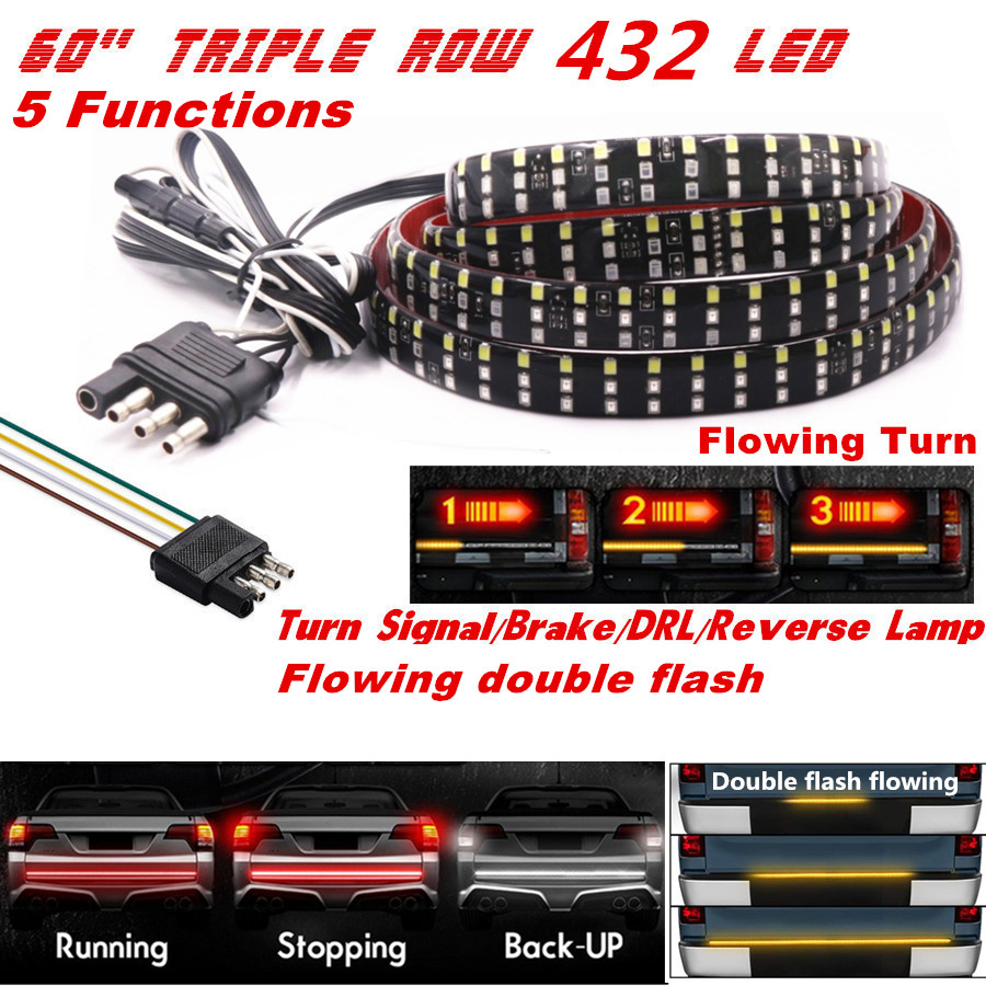 60" Triple Row LED 432SMD 3-Color Car Tailgate Turn Signal Lamp Strip Waterproof
