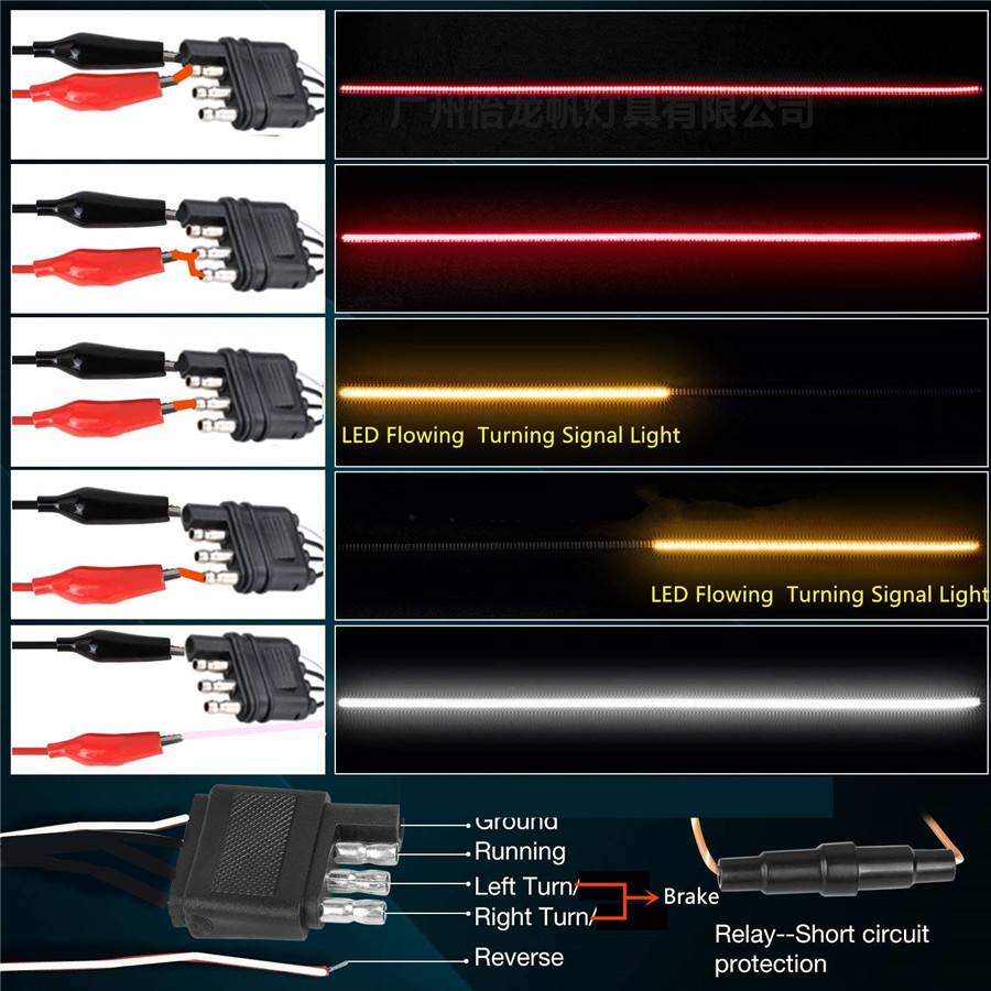 60" Triple Row LED Tailgate Light Bar with **FULL 1.High red Light for 2.Flowing amber light for left or right turn signals . 3.Flowing amber light for double flash. 4.White 5.Low red Light for running light. **BRIGHT **PREMIUM **QUICK **UNIVERSAL How If you want to stand out from all the other Flat Brown Wire: Ground White Wire: Running Light Yellow Wire: Left Turn Signal & Brake Green Wire: Right Turn Signal & Brake Red Wire: Reverse Light Specifications: - LED Type: 2835 LED Chip - Color: Red, Amber, White - LED QTY: 144 pcs Red + 144pcs Amber + - Functions: As left/right turn signal - Working Voltage: 12-16V DC - Universal Fit for most Pickup Trucks, - IP67 Waterproof rat Package 1 x Tri-row LED Tailgate Light