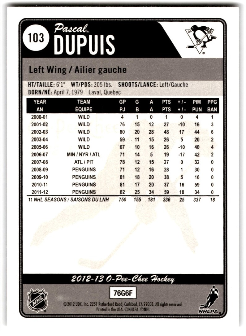 | 2012-13 O-Pee-Chee Rainbow Pascal Dupuis #103 Pittsburgh Penguins |