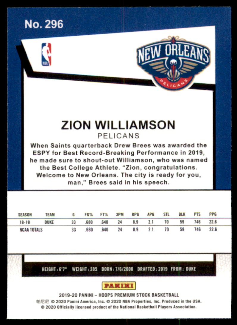 | 2019-20 Hoops Premium Stock 296 Zion Williamson |