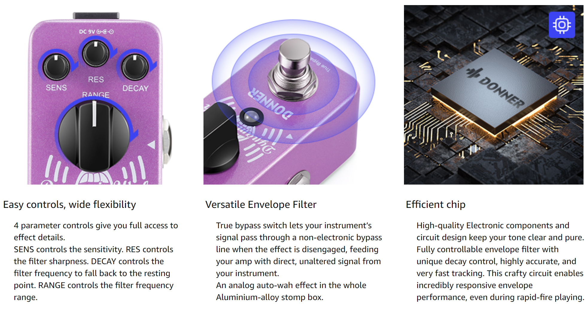 【 Four Function Knobs 】: SENS controls sensitivity; RES controls filter sharpness; Use DECAY to make filter frequency fall back to the resting point; RANGE sets the filter frequency range