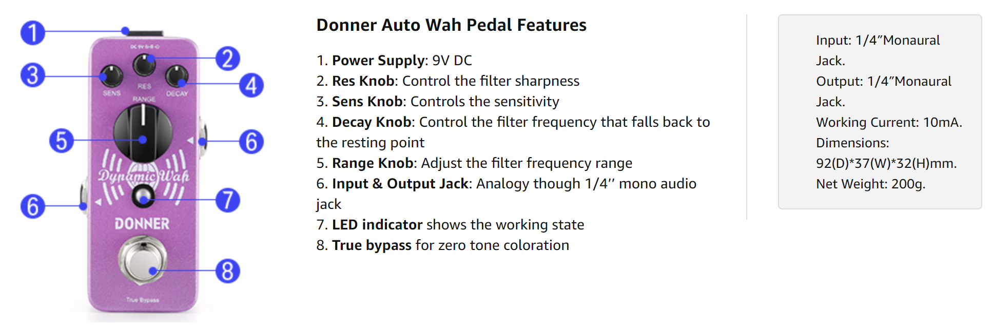 【 LED Indicator & True bypass 】: LED indicator shows the working state; Analog circuit design, true bypass provide transparent tone