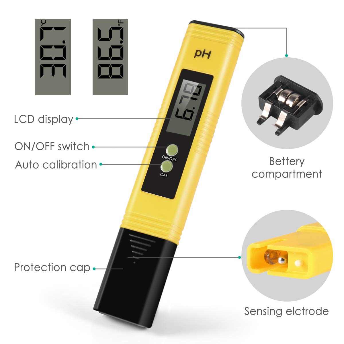 Auto Calibrated: Features in-built calibration with 2 buffer powders(included).Just press a button to finish the calibration. This pH meter is factory calibrated. Users can use it directly.