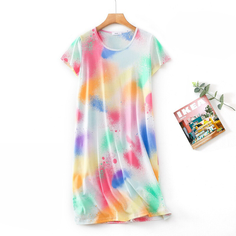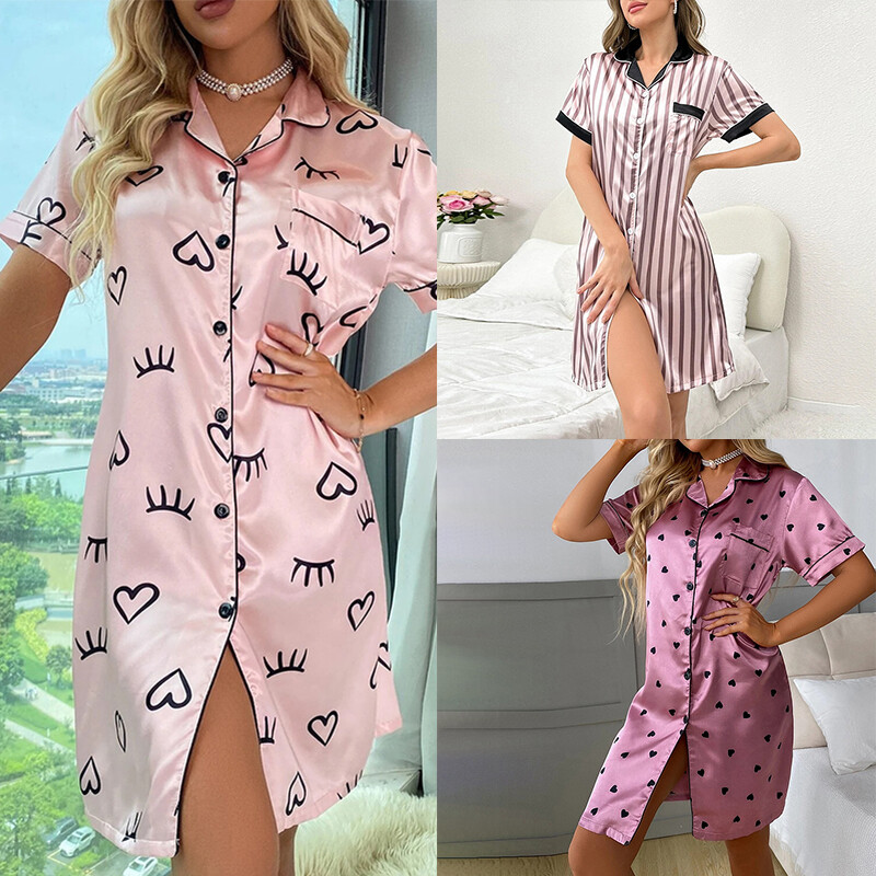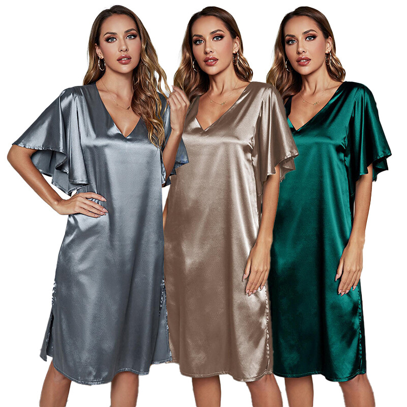 Top: Loose fit, satin short sleeve t-shirt. Solid color, crewneck, casual nightwear.