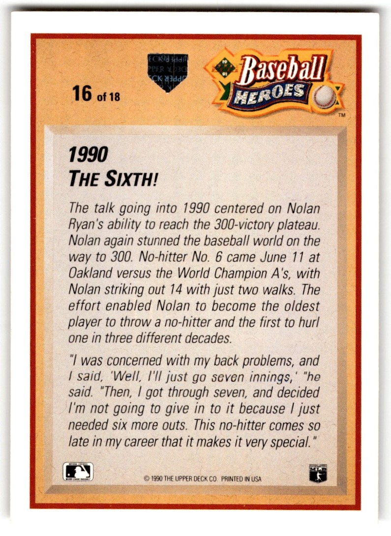 | 1991 Upper Deck Baseball Heroes Nolan Ryan #16 Texas Rangers |