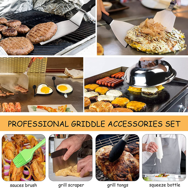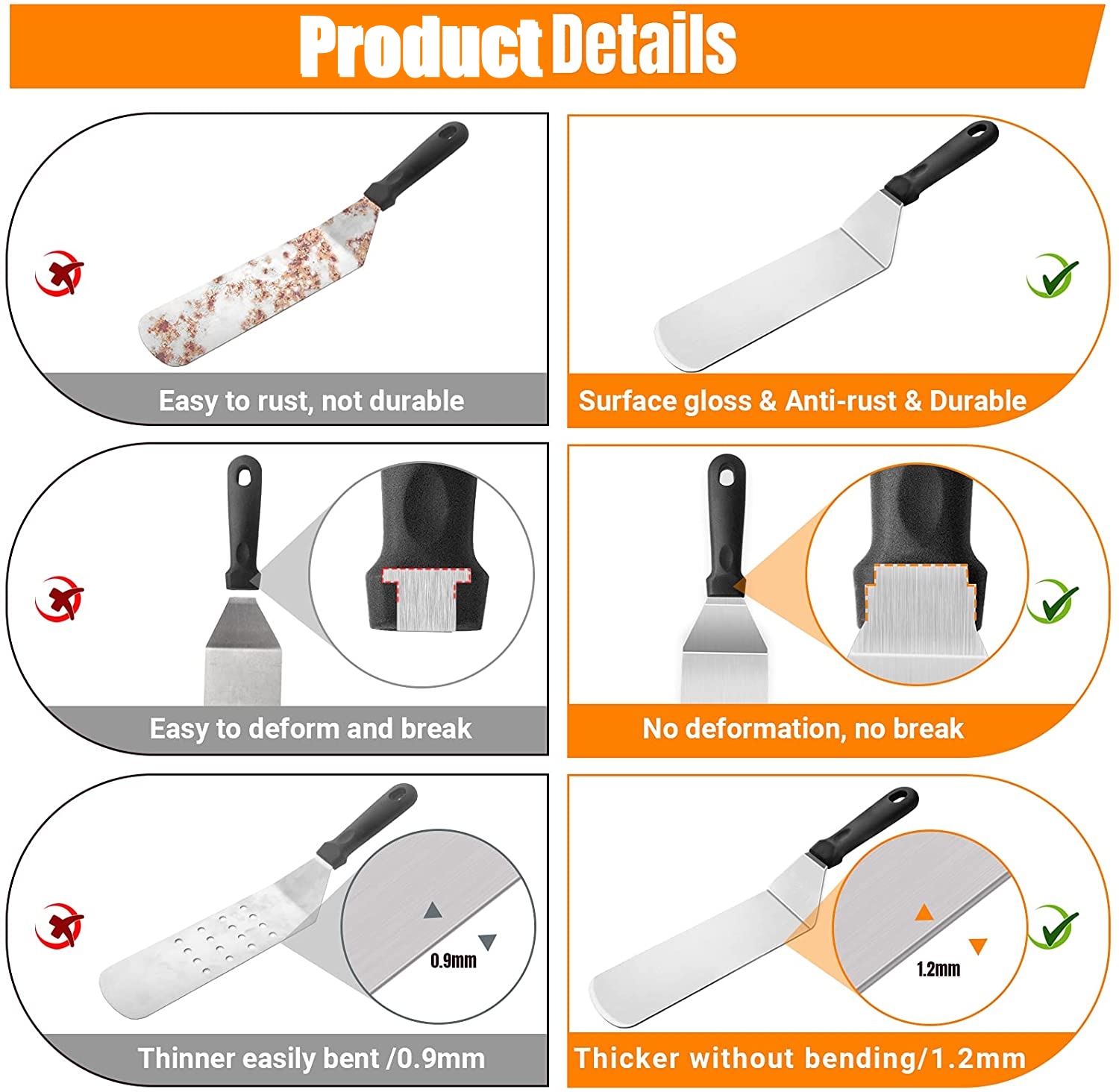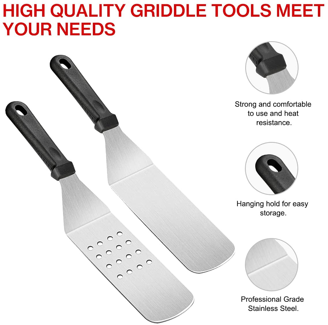 1. High-Quality Materials - our griddle accessories are made from commercial grade stainless steel with Ergonomic handle. durable plastic handle that resists heat and designed with hanging hole. heavy duty durable design and material bring significant long term value.
