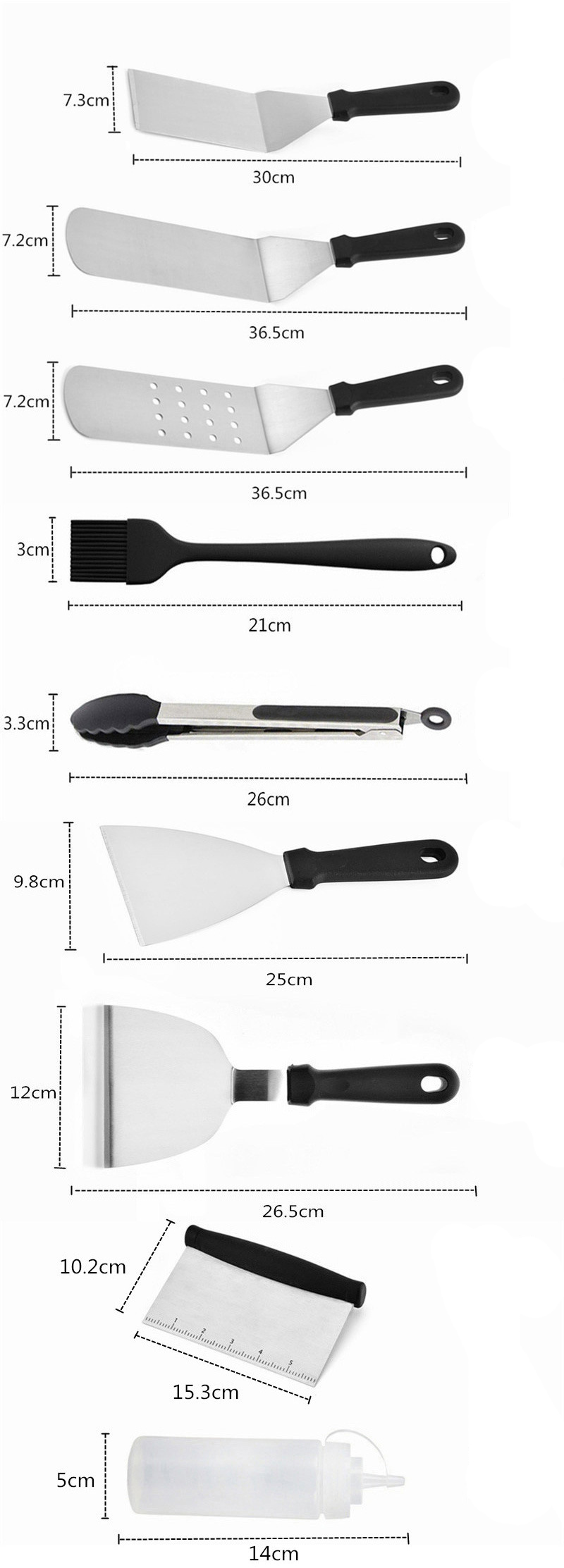 2. 13 Pack BBQ Tools - 2 Long Griddle Spatulas,great for flipping beef cubes, fried egg, rice, noodle and vegetables. 1 Shorter Spatulas with 3-sided bevel cutting edge, great for turning burger, pancake and cutting bread, meat and sausage. 1 Griddle Scraper,1 Scraper Chopper,1 Stainless Steel Grill Tong,2 Bottles, 2 Egg Rings,1 Cleaning Brush,1 Korean Spatula.