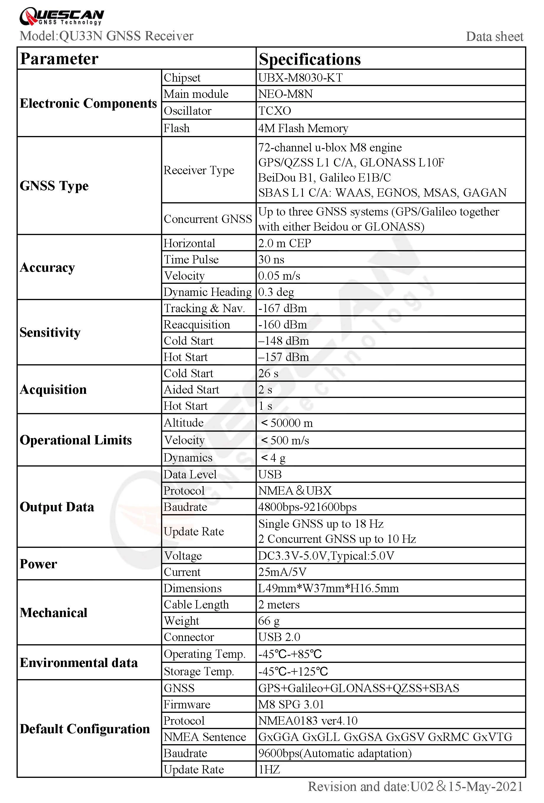 QU33N is a multimode USB GNSS receiver with built-in ubx neo-m8n module and built-in 4M flash to support configuration and permanent saving of configuration. The UBX-M8030 high performance standard precision GNSS chips from u-blox provide exceptional sensitivity and acquisition times for all GNSS systems. The chips utilize concurrent reception of up to three GNSS systems (GPS/Galileo together with either Beidou or GLONASS). Reception from more than one constellation simultaneously allows extraordinary positioning accuracy in urban canyons, even with weak signals and high dynamics. The accuracy reaches 2.0m cep,and the average cold start time is 26s.It also has built-in small battery to support receiver hot start.It is widely used in PC navigation, car navigation, sea navigation, ranging, automatic driving travel, fleet management, vehicle tracking, etc. It supports Google Earth, and the external GPS receiver cooperates with Google Earth for precise positioning.This product supports Android 4.0 and above systems, download the APP(GPS Connector.APK)for Android systems, and set mock location.Get more accurate positioning for your Android smart device! Highlights: • Concurrent reception of up to 3 GNSS (GPS, Galileo, GLONASS, BeiDou) • Industry leading –167 dBm navigation sensitivity • Industry lowest current consumption • Superior position accuracy in urban canyons • Security and integrity protection • Support for all satellite augmentation systems