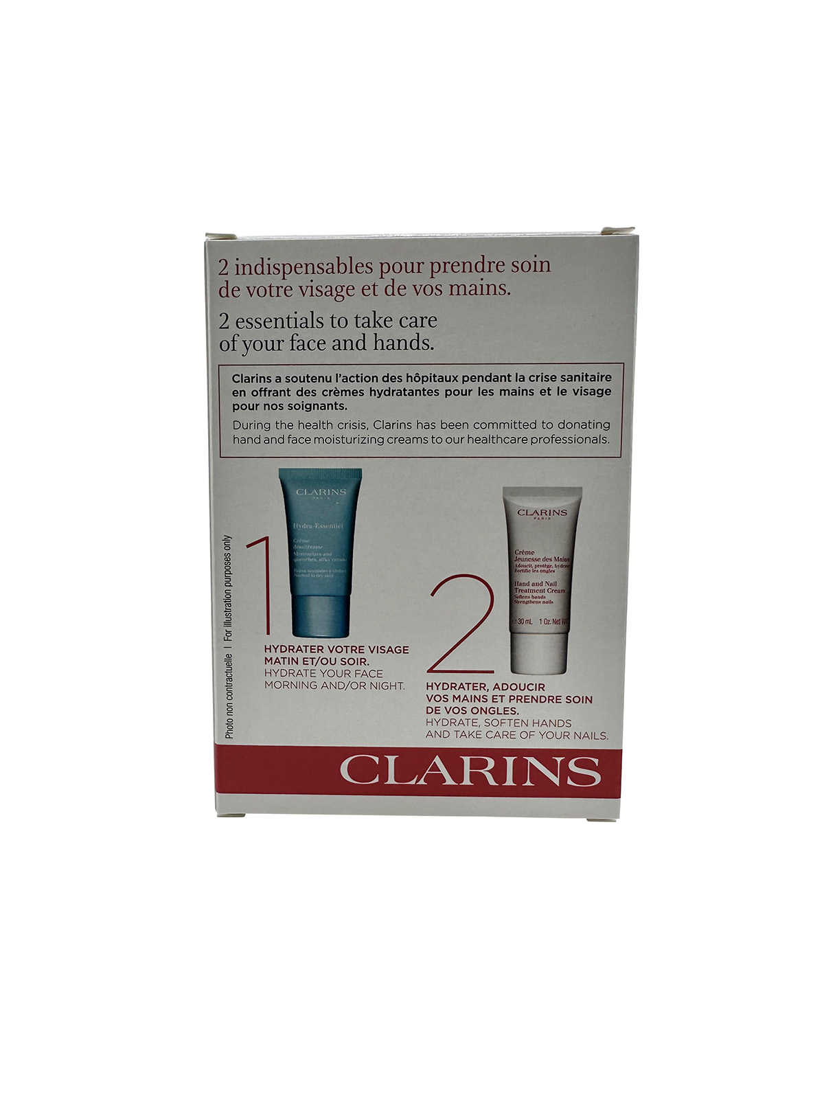 Clarins Intense Hydration Kit brings to great product two keep your hands and skin hydrated. Created for all sin types, including Normal, Dry, Combination, and Oily. This set brings one Intense Hydration Hand & Nail Treatment 1 oz. Formulated to deliver intense hydration to the hands, which can become dry and dehydrated due to various factors such as weather, frequent washing, or exposure to harsh chemicals. Moisturizes and replenishes the skin, leaving it feeling soft and supple. Protects your hands from environmental aggressors. Non greasy formula easily absorbs into the skin. Besides the hydrating benefits for the hands, this treatment also strengthens and conditions the nails and cuticles. It may help to improve the appearance and health of nails, promoting their growth and minimizing breakage. Created rich is Shea Butter, Sesame Seed Oil, and Myrrh. The second product in this set is the Hydra Essential Matte Gel Moisturizer 0.5 oz. This is a specialized lightweight moisturizer that helps to nourish skin and leave you with a perfectly mate complexion. Provides 24 hours hydration and plumping. Leaves your skin feeling refreshed. Made with Camellia Seed Oil, Tapioca Starch, Citric Acid, and Glycerin. How to use: Both products can be used on cleansed skin both day and night. These are travel sized products that are TSA approved.