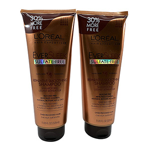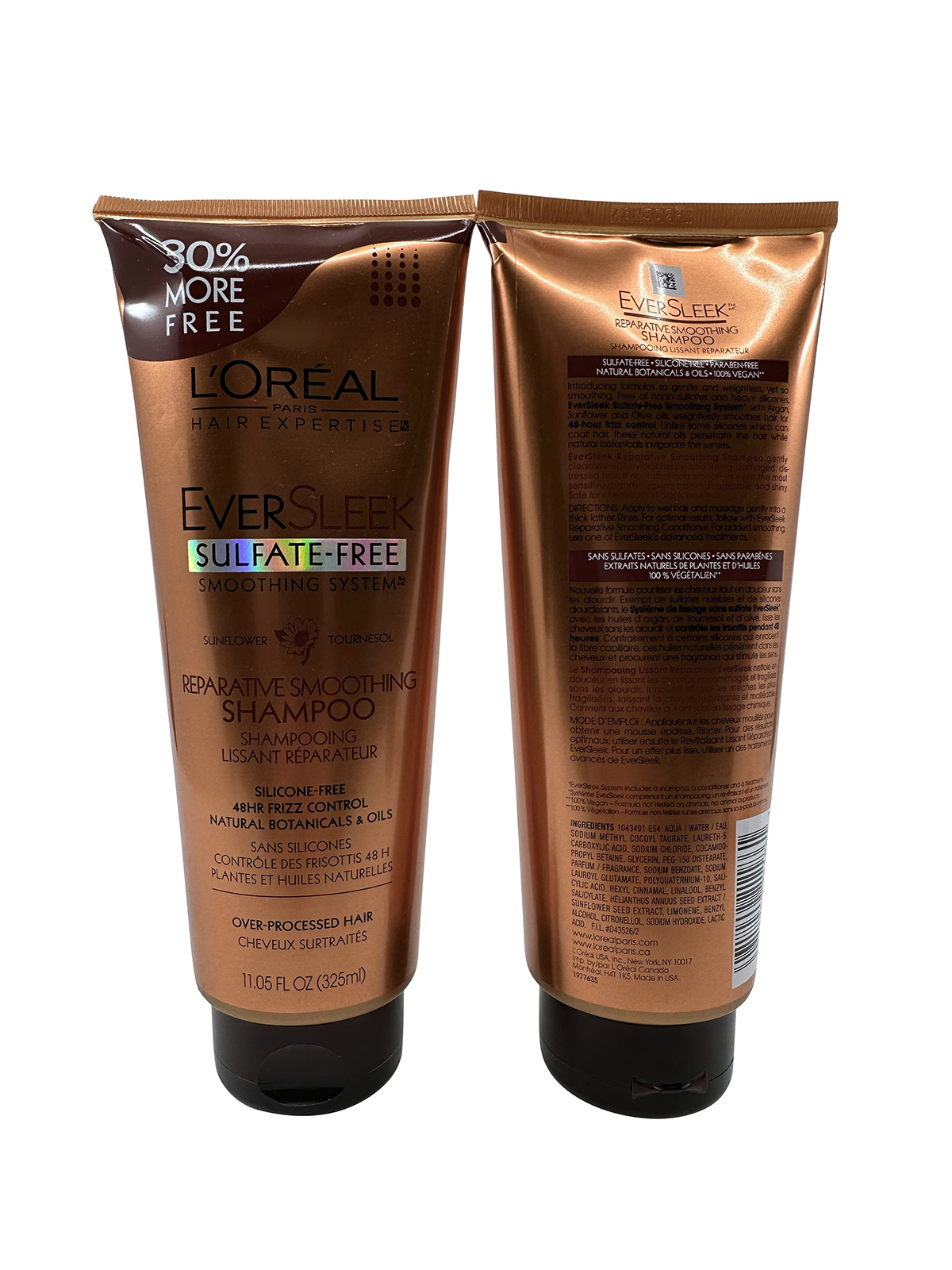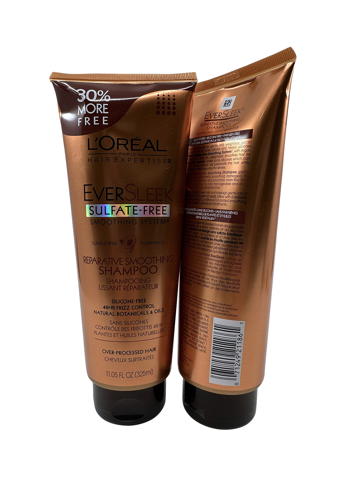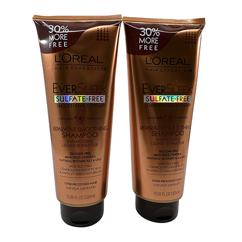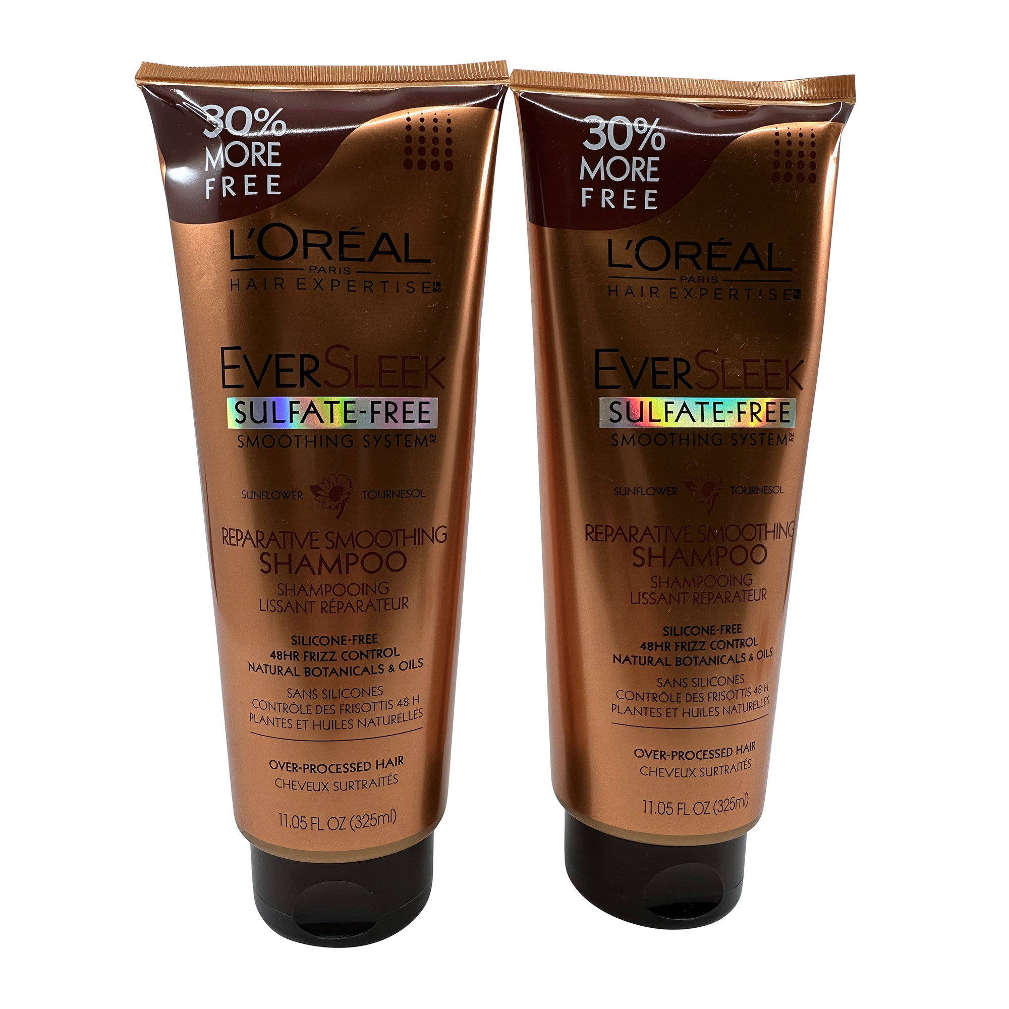 LOreal Eversleek Reparative Smoothing Shampoo for Damaged and Over Processed Hair is an everyday use formula that helps to gently cleanse hair of residue and buildup while repairing, nourishing, and protecting your hair from damage and dryness. Great for those who have damaged hair, frizzy hair, coarse hair, overprocessed hair. Made rich in sunflower oil, hydrolyzed wheat protein, citric acid, sorbic acid, and sweet almond oil. Leaves your hair soft, full of shine, and protected from dryness and dullness. Enhances your hairs natural shine and reinforces its natural keratin bonds. How to use: Apply shampoo onto wet hair from roots to ends. Massage well and lather. Rinse and repeat if needed. Works best when used along with LOreal Eversleek Conditioner. This product is sulfate free and silicone free. Provides you with up to 48 hours of frizz protection. This is a set of 2 shampoos, each is 11.05 oz.