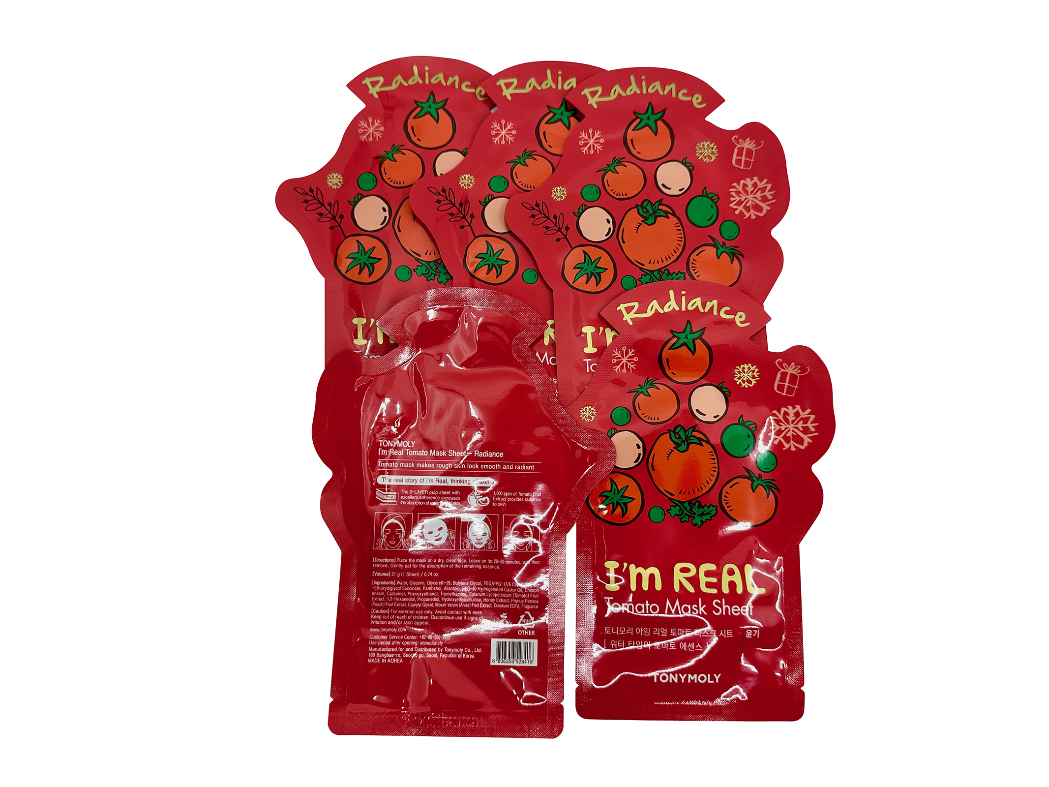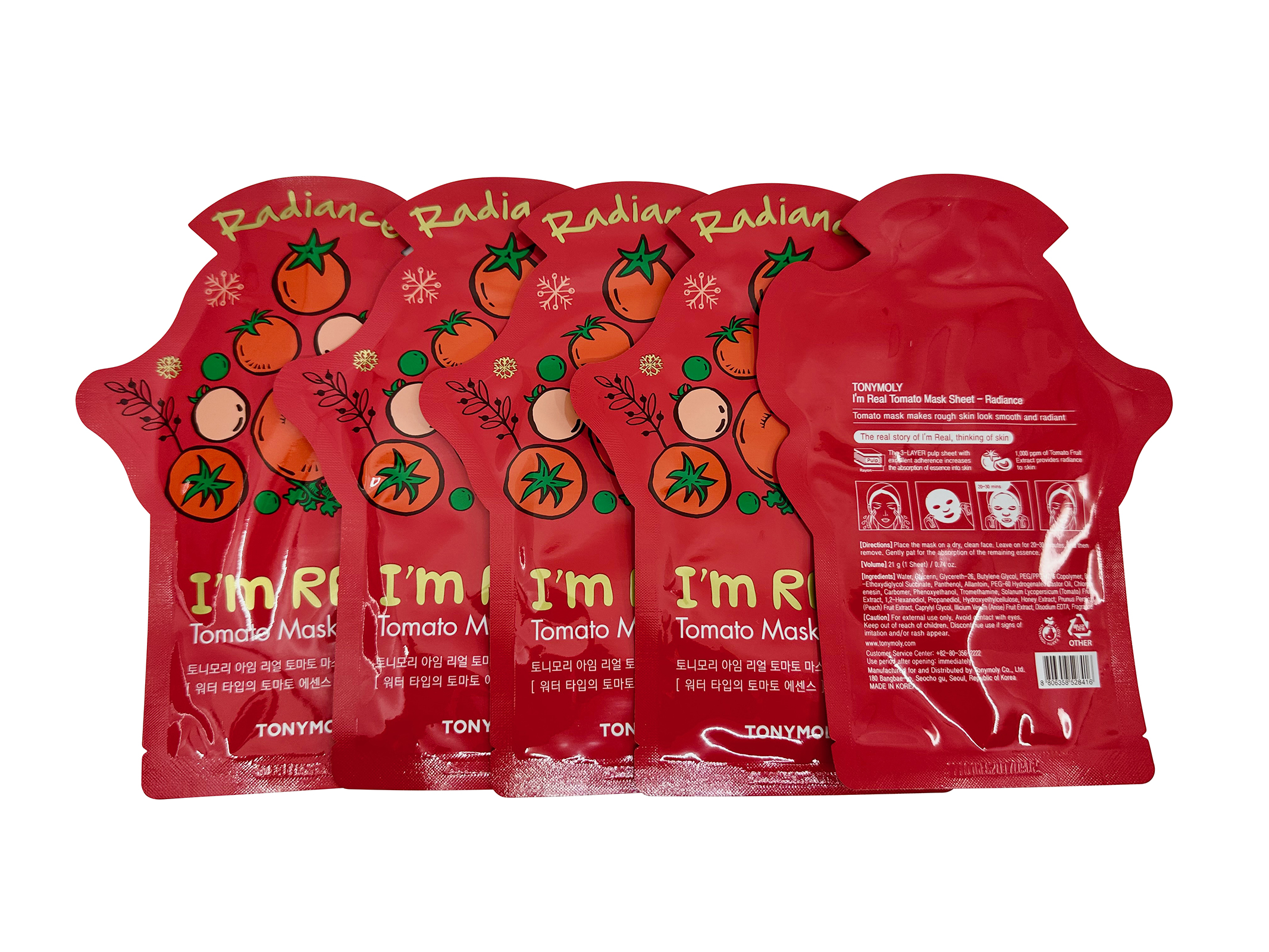 TonyMoly Tomato Radiance Care Mask Sheet is a brightening and hydrating sheet mask treatment for all skin types. This is a three layer pulp sheet mask. Drenched in nourishing ingredients to help soothe, hydrate, and renew your skin. Made rich in Lemon Extract, Peal Extracts, and Avocado Extracts to boost radiance. Tomato and Seaweed Extract helps to remove skin impurities and to purify the skin and pores. Pomegranate, Rice and Pumpkin Extracts improve elasticity. Contains tea Tree Oil Extract to help fight inflammation. Korean Rise Wine helps to smoothen skin texture. Aloe Leaf Extract hydrates skin. TonyMoly Sheets Masks are made with three types of essences, Water Essence, Micro essence, and Milky Lotion. These three essences work together to give your skin maximum moisture, protection, and glow. TonyMoly is a top selling Korean Beauty skincare line. Known for their unique packaging and their quality ingredients. They have taken on skincare and cosmetics with a fun outlook and are truly changing the way people view skincare. Their products are affordable and effective. This is a cruelty free product, made without the use of artificial colors, parabens, or talcs. Packaging is biodegradable. How to use: To apply sheet mask, start with clean skin. Apply sheet mask to face and gently tap onto skin. You can use a roller to help absorption. Leave mask on for 20 � 30 minutes. After 20 � 30 minutes remove mask and gently massage excess essence onto face and neck until fully absorbed. This is a package of 5 masks. Other ingredients include Anise Fruit Extract, Peach Fruit Extract, Hydrogenated Castor Oil, Allantoin, Panthenol, and Tomato Fruit Extract.
