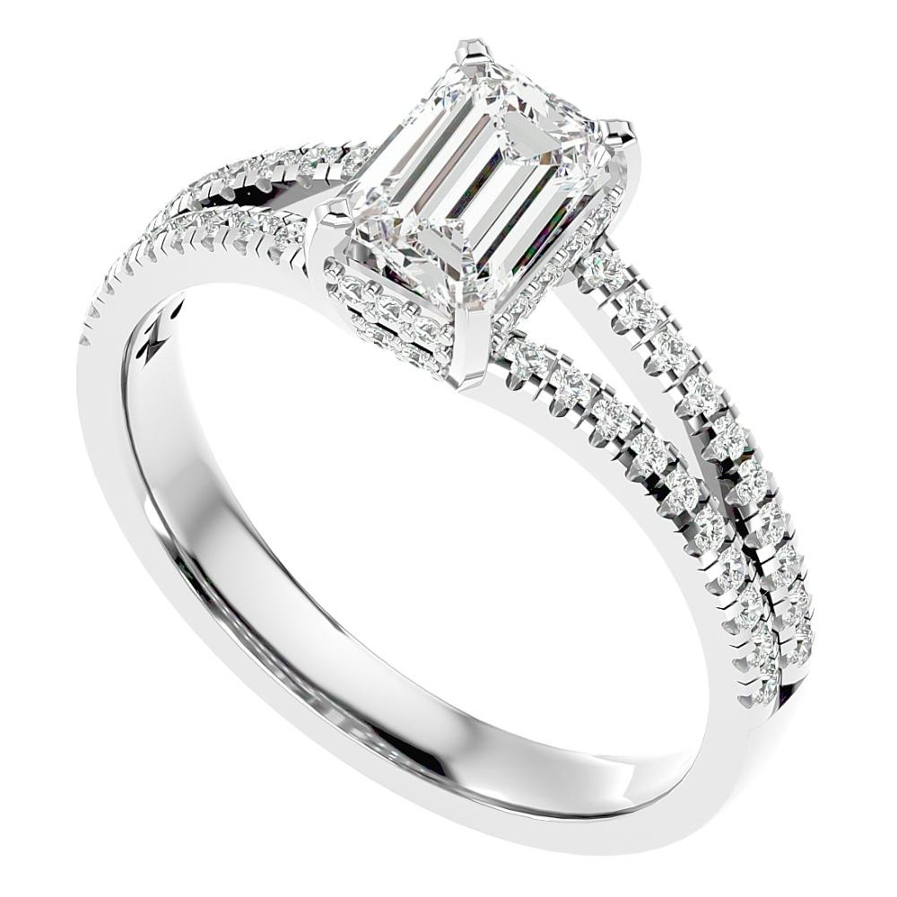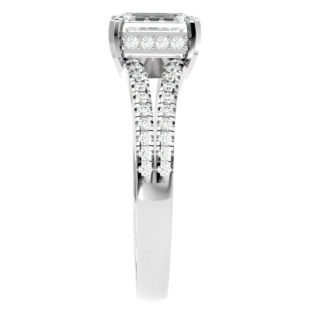 This stunning women's engagement ring features a 1ct emerald cut center stone and 58 round cut accent diamonds. All diamonds are prong set in solid gold high polished setting.