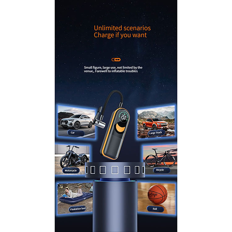 l Mainly used for car tire pressure insufficient make up air, outdoor bicycle, motorcycle, toy car, ball and so on will have a better experience