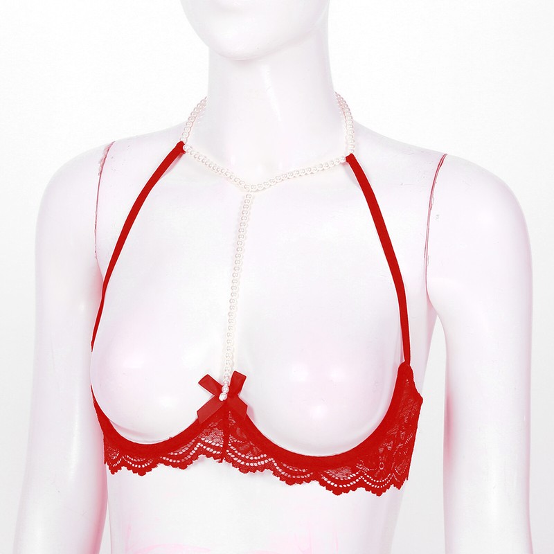 Womens Faux Pearl Halter Neck Underwired Bra Open Chest Lace Brassiere Sexy Lingerie Underwear.