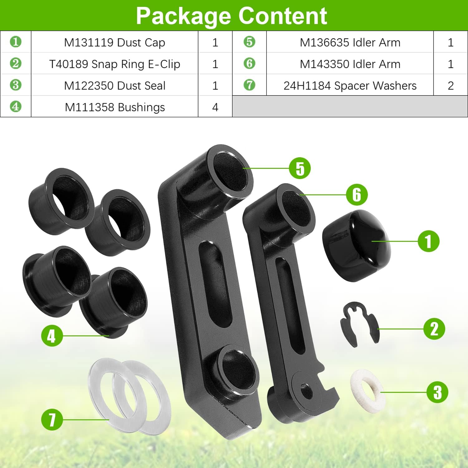 Deck Pulley Idler Arm Replaces: M114326 M136635, Deck Belt Tightener Arm Replaces: M111740 M143350, Bushing Replaces: M111358 M146073 M45262, Dust Cap Replaces: M111358 M131119 M72886 M111714, Dust Seal: M122350, Spacer Washers: 24H1184, Snap Ring E-Clip T40189.