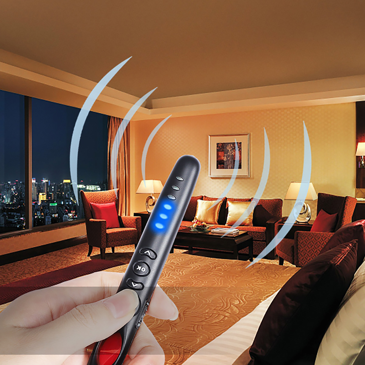 RF Detection: Move the multiple function switch to RF detection position, press the "next" & "previous" button to adjust the sensitivity, set the sensitivity to level 4, hold the detector to the suspicious area, if the detector LED light flashes with sound alarm, it means close to close to suspicious object, if the detector LED light dose not flash, you can increase sensitivity to level 5 or decrease the sensitivity if always alarm, please do not turn the sixth LED light on, it will reached the maximum sensitivity, the device will always alarm.