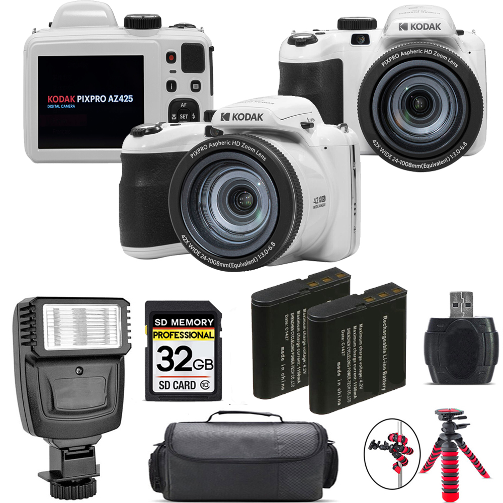 Kodak PIXPRO AZ425 Digital Camera (White) + Extra Battery + Flash - 32GB Kit
