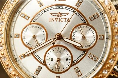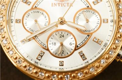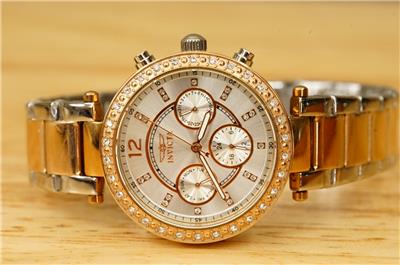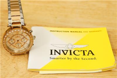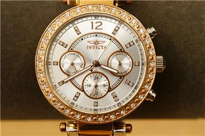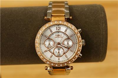 NOS INVICTA Angel Lady Collection Watch Model 20471 Quartz Rhinestone Rose Gold and silver (all stainless steel). Never worn. Band still in the clear wrap. Paperwork is present. 36MM stainless steel case. 100M water resistant. Does need a new battery. Crisp and clean. No smoke or pet odors. Bright clear rhinestone accents.