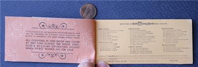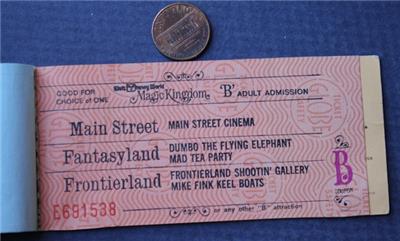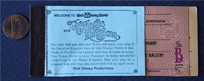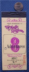 Check it out...Here's a classic 6" wide by 2 1/2" tall mostly empty "8 Adventure" ticket book from the early 1970s era Walt Disney "Disney World" theme park in Orlando, Florida- The brightly colored cover features the Magic Kingdom name logo on both front & back-Opens up to a lengthy list of all of the park's attractions and themed lands inside including some that are no longer located there- Originally cost $ 6.50 and listed as a $ 10.30 value (My how times and prices have changed!) These ticket books originally contained 10 tickets inside (Remember those "E" tickets for the good rides?) and there is still one ticket intact inside, a "B" ticket-I think the park stopped using these around 1982 or so- A cool vintage item for display though- Good condition with usual wear consistent with age and normal use-This is an ORIGINAL item, NOT A REPRODUCTION item! Postage information is listed at the bottom-$ 5.95 postage is required.