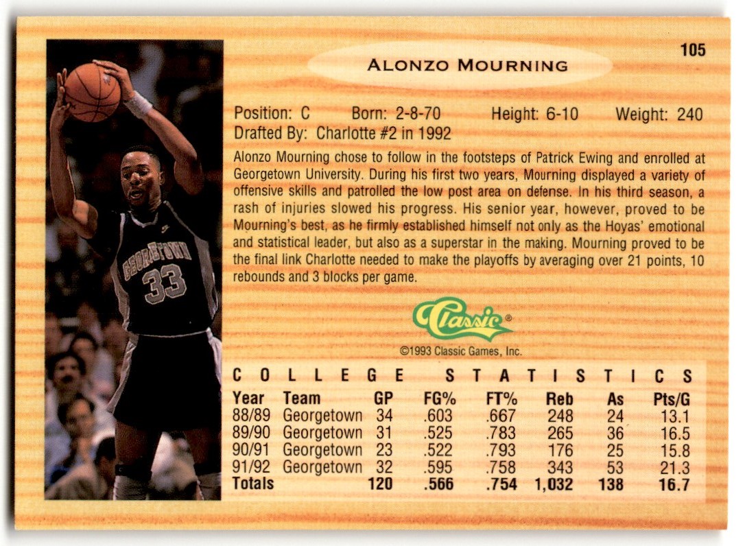 | 1993-94 Classic Draft Picks Alonzo Mourning #105 Georgetown Hoyas/Charlotte |
