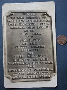Check it out...Here's a classic & VERY UNCOMMON @ 4" wide by 6 1/2" tall VINTAGE sepia-toned wirephoto from the late-1920s Era that features a GREAT image of the plaque on the BPOE / Elks organization bust statue of President Warren G. Harding-Features the bust statue atop a stone pillar with a plaque attached to the front reading: "Erected to the Memory of Warren G. Harding Past Exalted Ruler Marion, Ohio Lodge No. 32 B.P.O. Elks and President of the United States 1921-1923. This Memorial Erected by the Maryland, Delaware and District of Columbia State Association B.P.O. Elks 1926" on front-How fun is that? Has copyright info reading: "From Richardson's Studio of Photography Bedford, Virginia" inset on the back-(See photos below for clarification)-Very cool item in good condition and ready to display! How many of these throwaway items survived? This is an ORIGINAL item, NOT A REPRODUCTION item! Postage information is listed at the bottom-$ 5.95 postage is required.