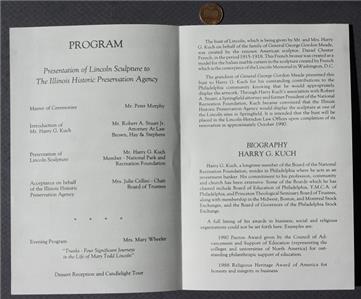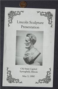 Check it out...Here's a unique & unusual 5 1/2" wide by 8 1/2" tall bi-fold program from the sculpture presentation ceremonies of an Abraham Lincoln statue once owned by famed Gettysburg Civil War Hero General George Gordon Meade at the Old State Capitol Building in Springfield Illinois on May 3, 1990-The program features a GREAT image of Abraham Lincoln on front with the planned program & speakers inside-How cool is that? A great vintage item that would display so nicely! Has minor wear only (See images below for clarification)-How many of these throwaway items survived? This is an ORIGINAL item, NOT A REPRODUCTION item! Postage information is listed at the bottom-$ 4.95 postage is required.