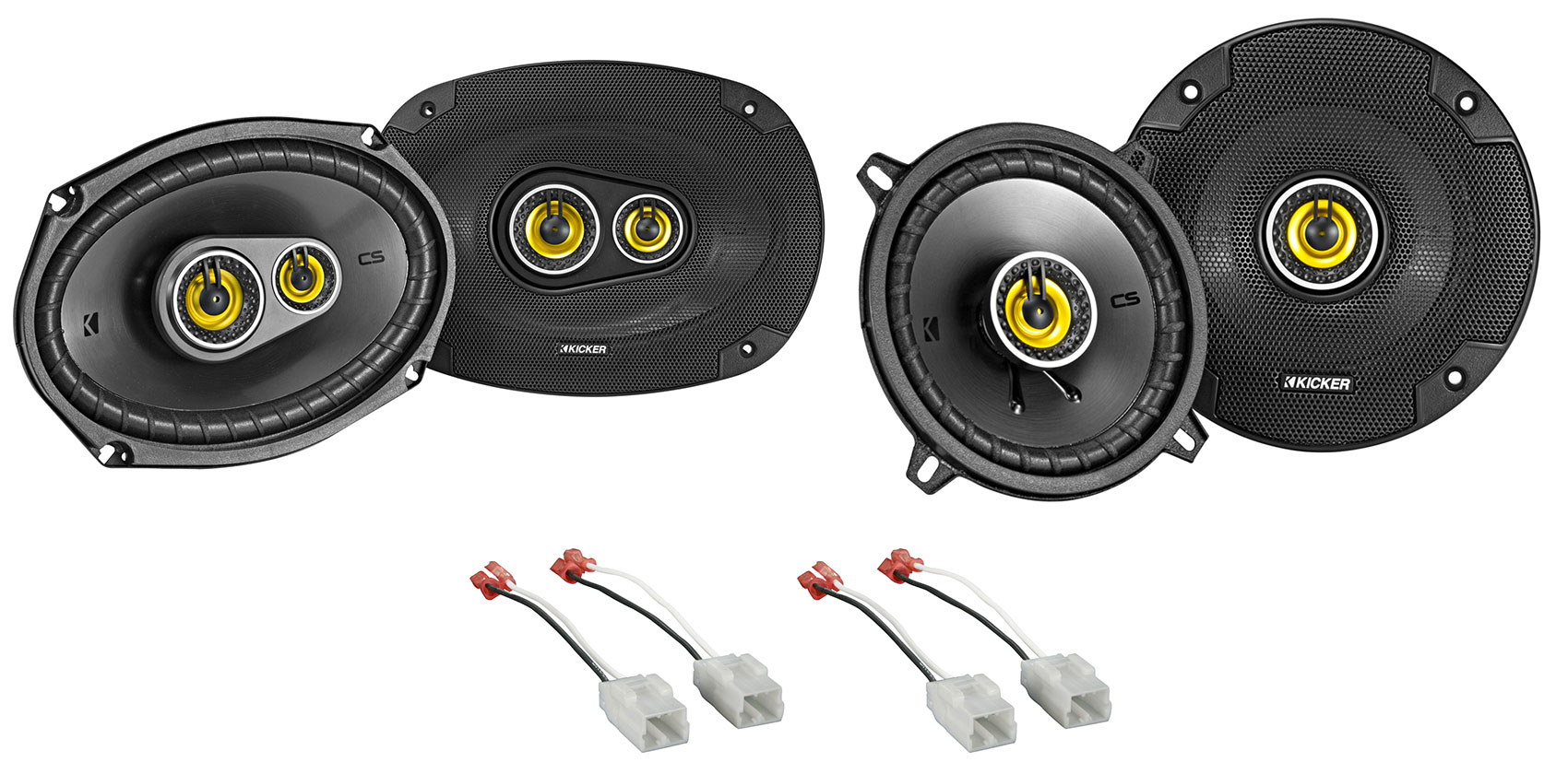 Package: Pair of Kicker 46CSC6934 6"x9" 6x9" 900 Watt 4-Ohm 3-Way Car Audio Speakers CSC693 + Pair of Kicker 46CSC54 5.25" 450 Watt 4-Ohm 2-Way Car Audio Coaxial Speakers CSC54 + (2) Metra 72-6514 Speaker Harness Connector for Chrysler/Dodge/Jeep Cherokee Quick and Easy Install