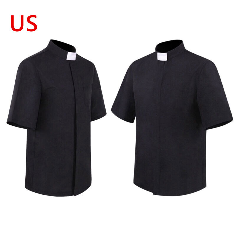 Designed with stand collar, short or long sleeve, contrast tab on front collar, classic black color, making a blessed priest look.