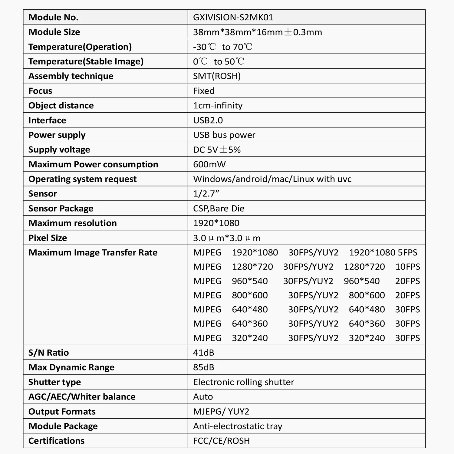 High Frame Rates:MJPG 1920*1080 30fps;YUV 1920*1080 5fps;
