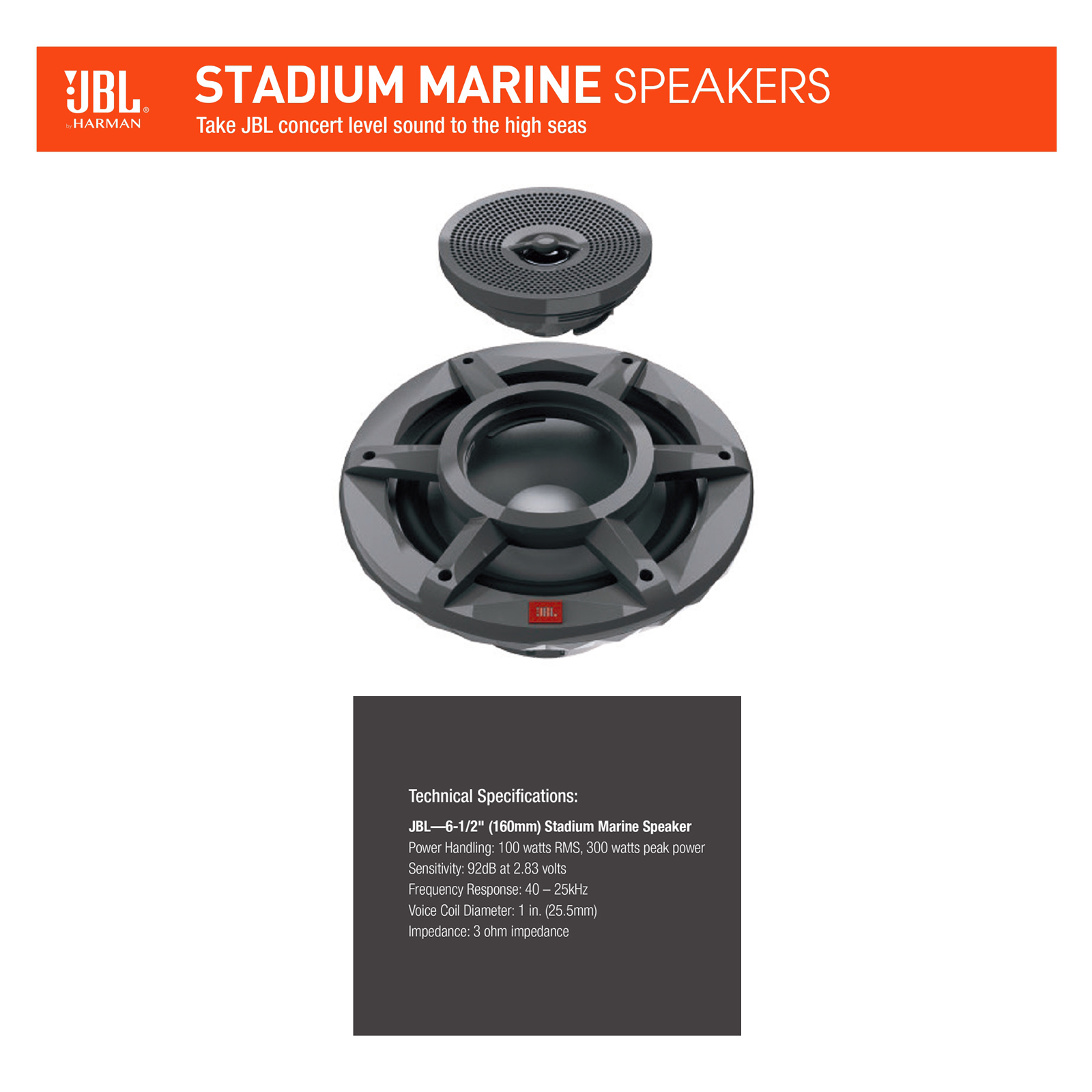 • The JBL’s Stadium Marine 6.5" coaxial speakers have Plus One polypropylene woofer and midrange cones, Mylar tweeter domes, one piece cast polymer baskets, sealed magnets, and rubber woofer surrounds for high SPL performance.