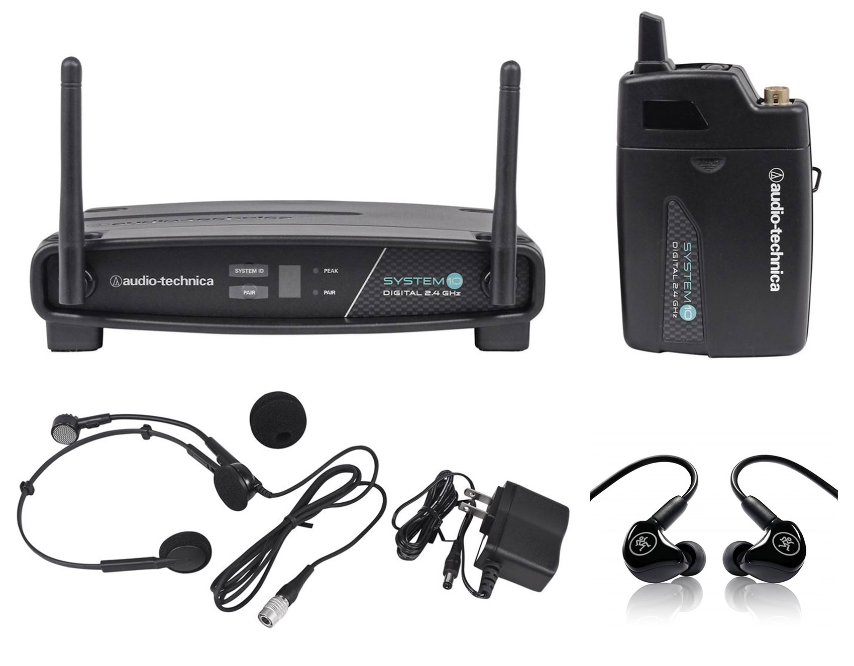 Package: ATW-1101/H System 10 Wireless Digital Headworn Microphone System With Transmitter and Receiver - 24 Bit Digital Operation For Premium Sound - Automatic Frequency Selection For Interference Free Operation + Mackie MP-120 Single Dynamic Driver Professional In-Ear Monitors + Carry Case