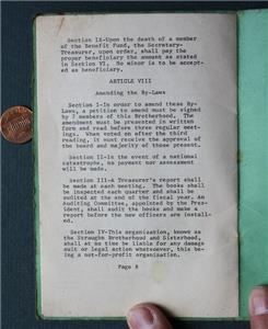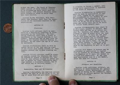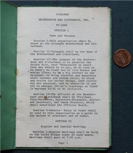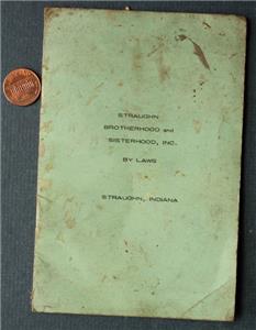 Check it out...Here's a VERY UNUSUAL item from a 1940-50s Era (I'm guessing) tiny town on the Historic National Road in Straughn, Indiana. The 4" wide by 6" tall green & black multi-paged booklet is titled: "Straughn Brotherhood and Sisterhood, Inc. By Laws Straughn, Indiana" on front and has the aims, goals & rules governing the club listed on the pages inside. No pictures but lots of info! Cover wear and soiling consistent with age and normal use and original owner has written some notations about postage / air mail costs in ink on the back cover-A great vintage item. How many of these throwaway items survived? This is an ORIGINAL item, NOT A REPRODUCTION item! Postage information is listed at the bottom-$ 4.95 postage is required.